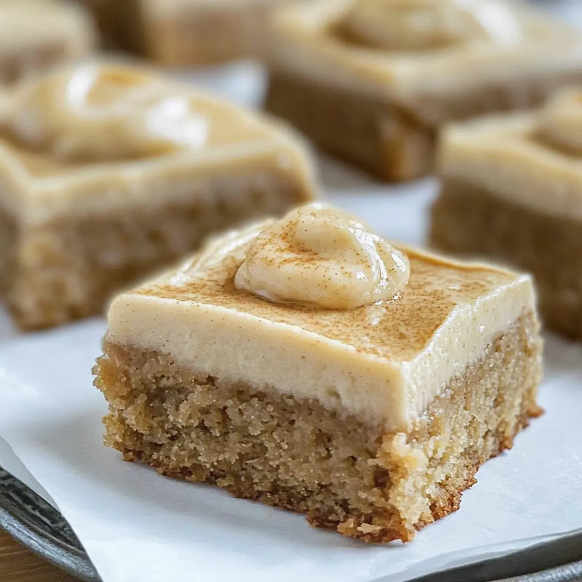 Nachdem die Blondies vollständig abgekühlt sind, gieße das Frosting gleichmäßig darüber und verstreiche es mit einem Spachtel oder einem Messer. Lass die Glasur fest werden, bevor du die Blondies in gleichmäßige Quadrate schneidest. Jetzt sind deine saftigen Banane Brot Blondies bereit, serviert zu werden!
