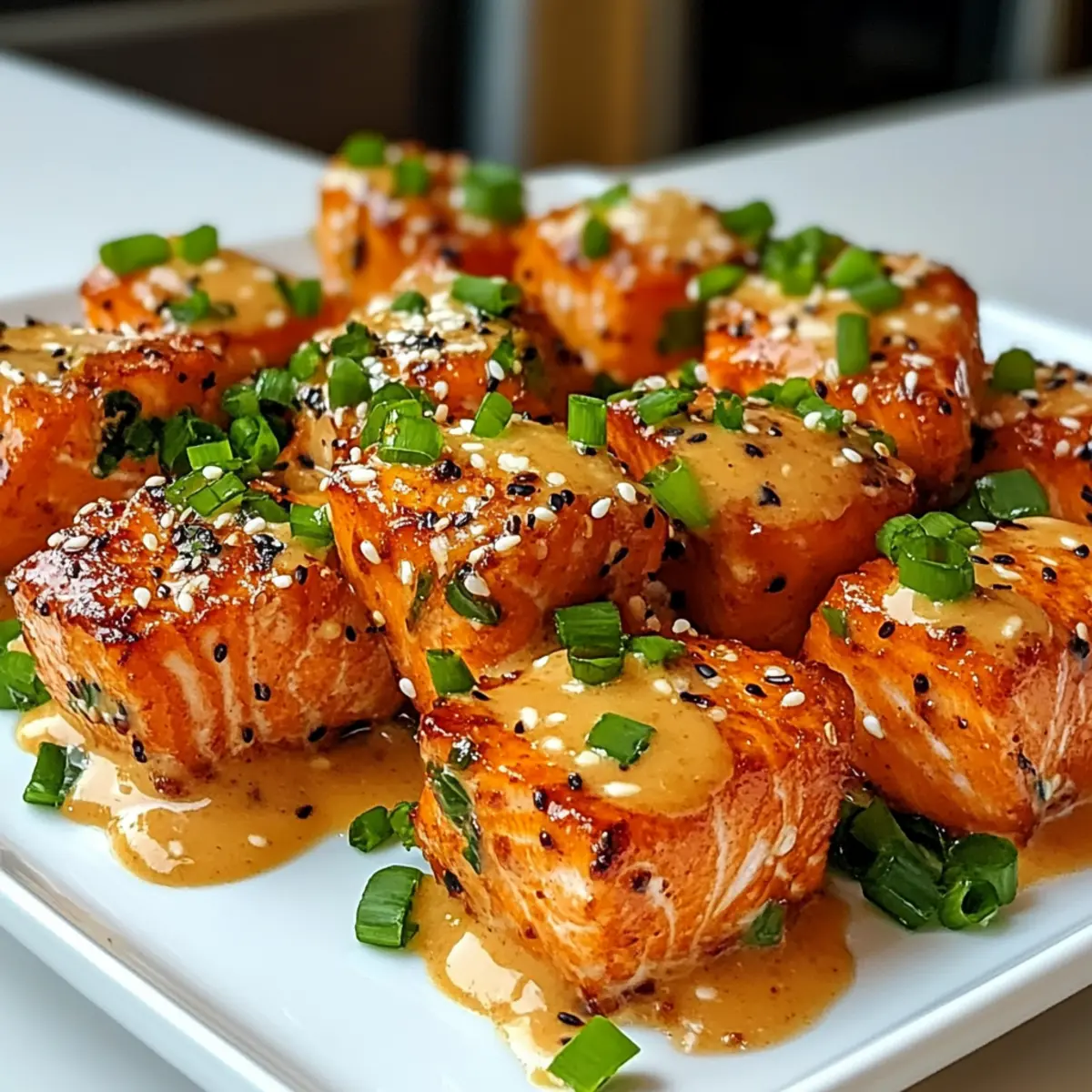 Nehme die gekochten Lachs Häppchen aus der Pfanne oder dem Ofen und gieße die Bang Bang Sauce darüber oder wende die Stücke vorsichtig in der Sauce. Garniere die Häppchen nach Belieben und serviere sie sofort. Diese leckeren Bang Bang Lachs Häppchen sind jetzt bereit, deinen Gästen präsentiert zu werden!