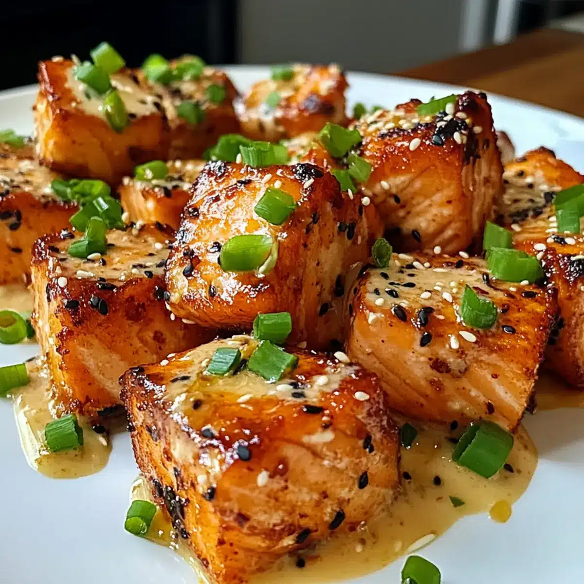 - Erhitze eine antihaftbeschichtete Pfanne bei mittelhoher Hitze. Gib die Lachswürfel hinein und brate sie für 2-3 Minuten auf jeder Seite, bis sie goldbraun und knusprig sind.