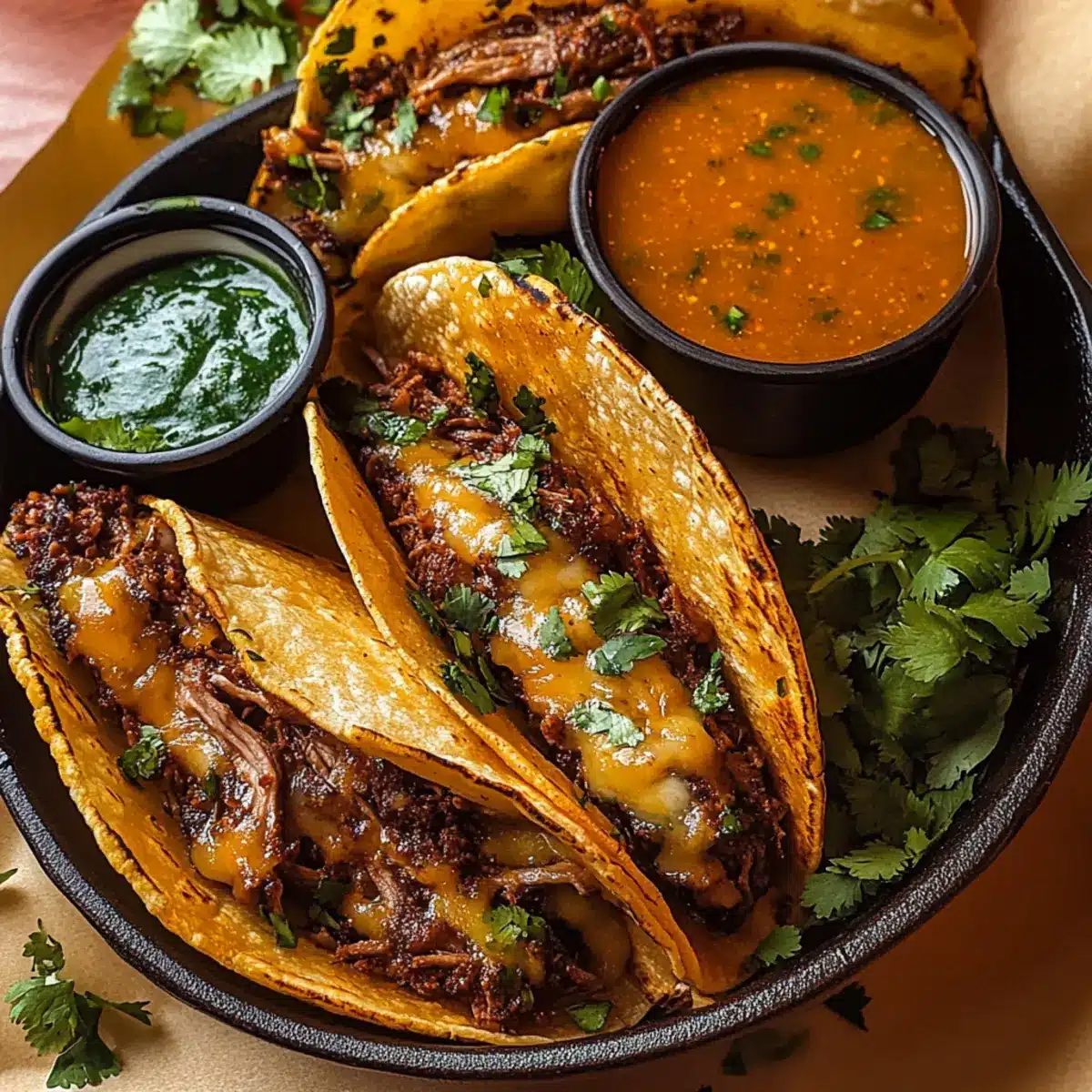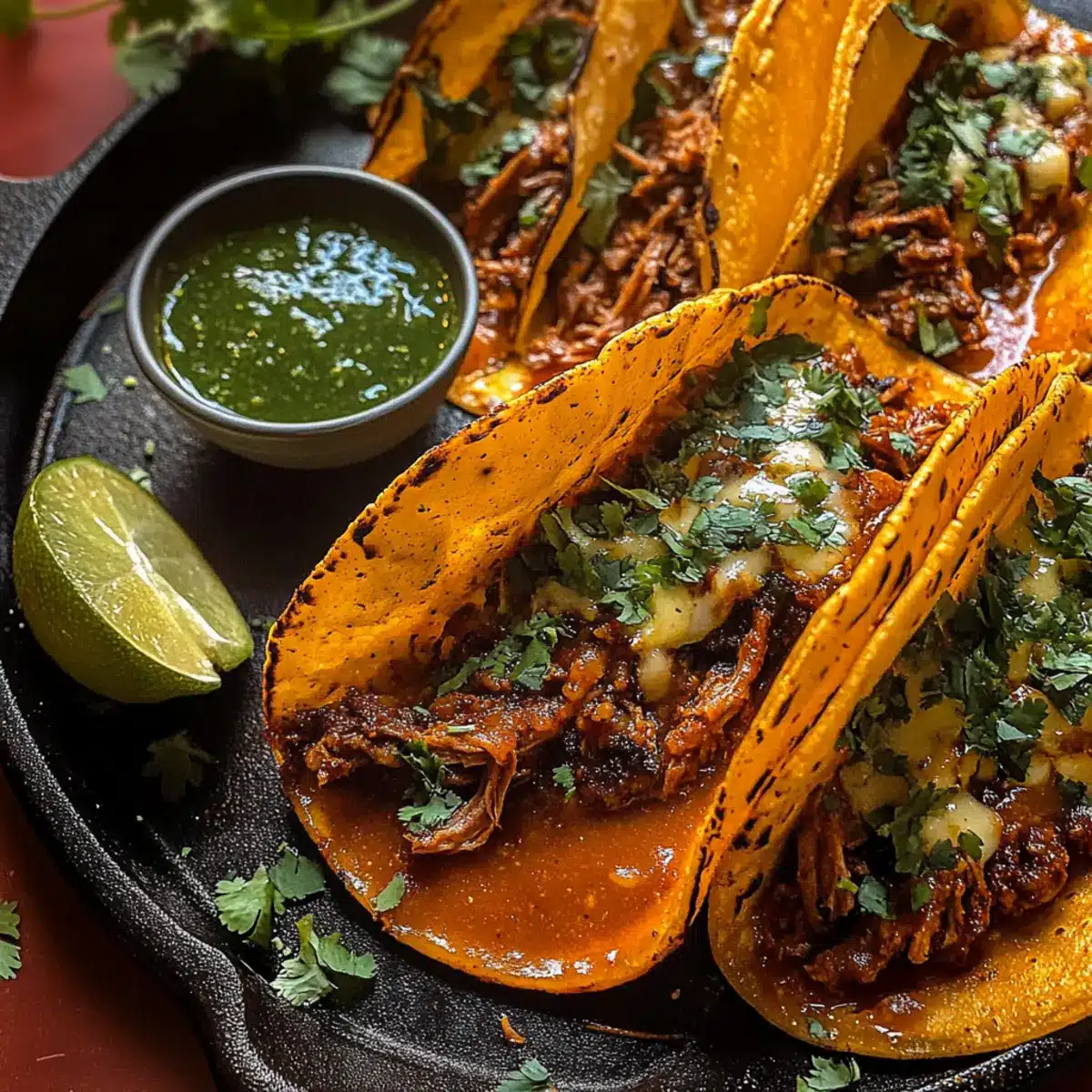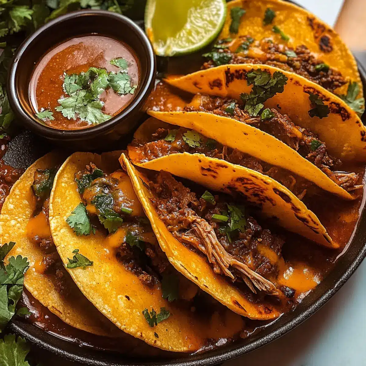 - Serviere die Birria-Tacos heiß mit der restlichen Consomé zum Dippen.