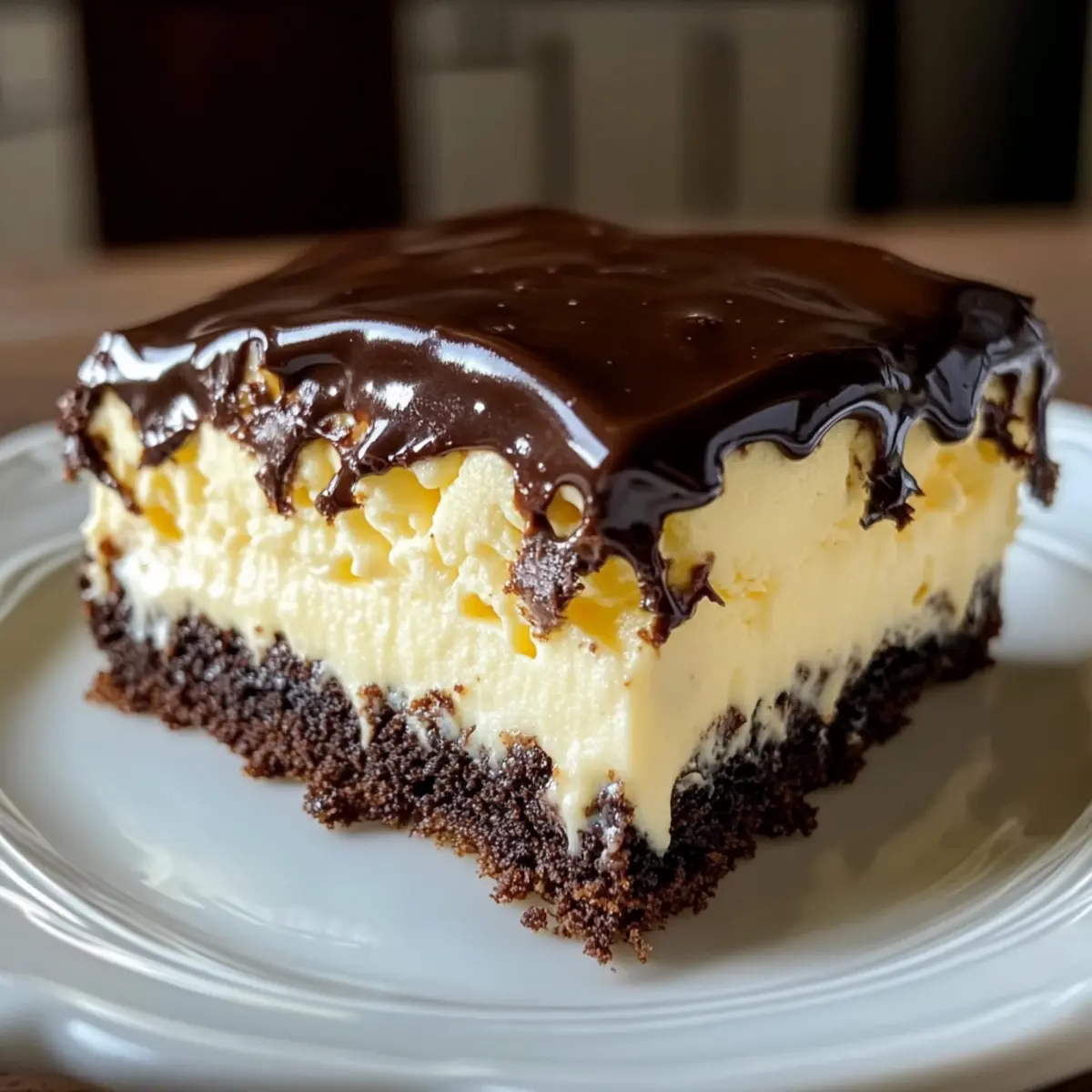 Nehmen Sie den gekühlten Kuchen aus dem Kühlschrank und gießen Sie den Schokoladenguss gleichmäßig über die Pudding-Schicht. Verwenden Sie einen Spatel, um den Guss sanft zu verteilen und darauf zu achten, dass jeder Teil des Kuchens bedeckt ist. Der Guss sollte schön gleichmäßig fließen und der Kuchen wird sofort ansprechender aussehen, wenn er mit dem Guss fertig ist.