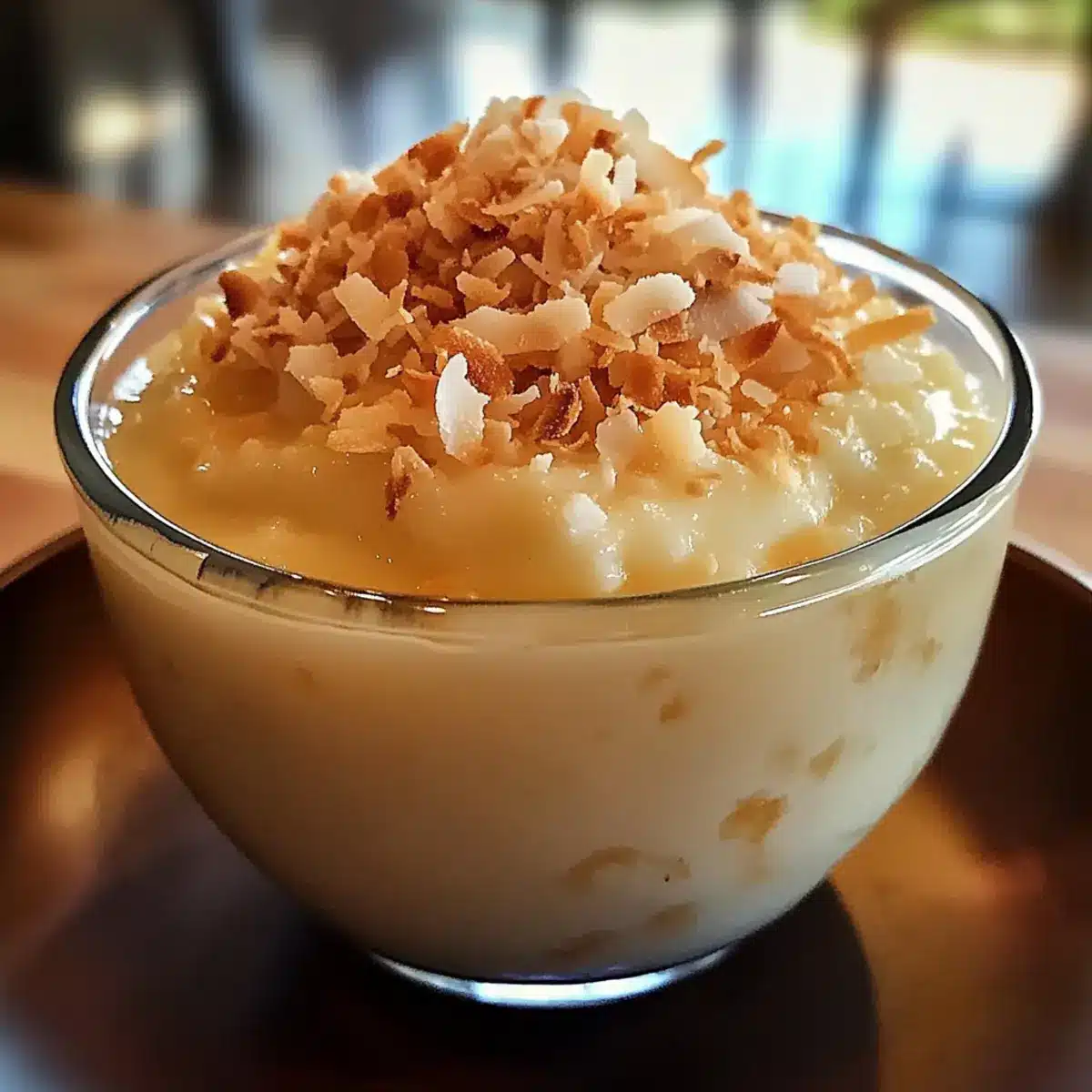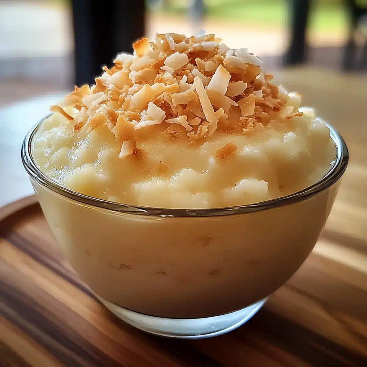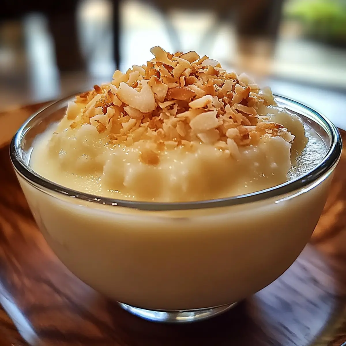 Geröstete Kokosnüsse: Die knusprigen, gerösteten Kokosnüsse bieten eine zusätzliche Textur und sind die perfekte Garnitur für den dekadenten Pudding.