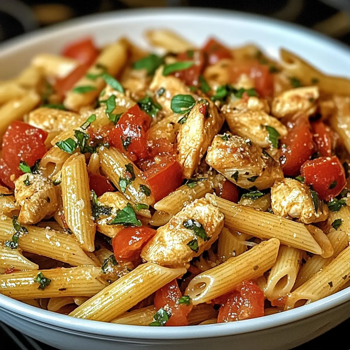 In der gleichen Pfanne, in der das Hühnchen gebraten wurde, erwärmt ihr dann die vorbereitete Bruschetta-Mischung bei niedriger Temperatur. Fügt die gekochten Penne-Nudeln hinzu und vermischt alles gut. Wenn es gewünscht ist, gebt das in Scheiben geschnittene Hühnchen dazu und werft alles vorsichtig um, sodass sich die Aromen entfalten. Optional kann frisch geriebener Parmesan darüber gestreut werden, bevor ihr serviert.