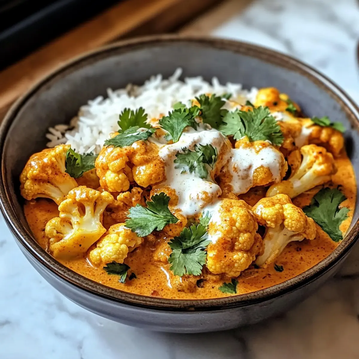 - Serviere den Butter Blumenkohl über Basmati-Reis und garniere mit frischem Koriander und griechischem Joghurt.