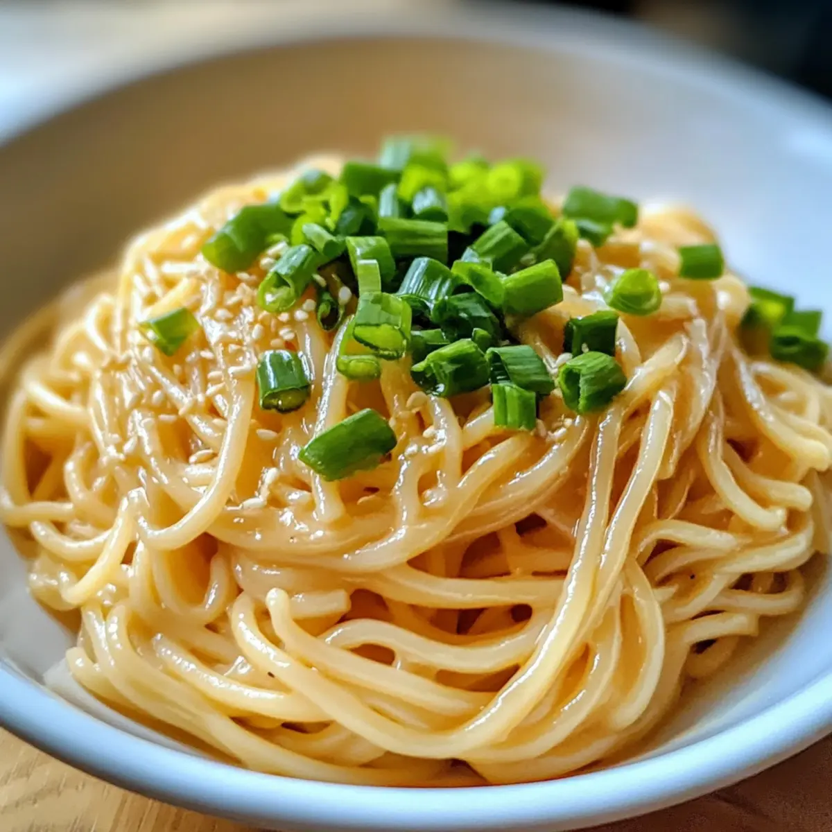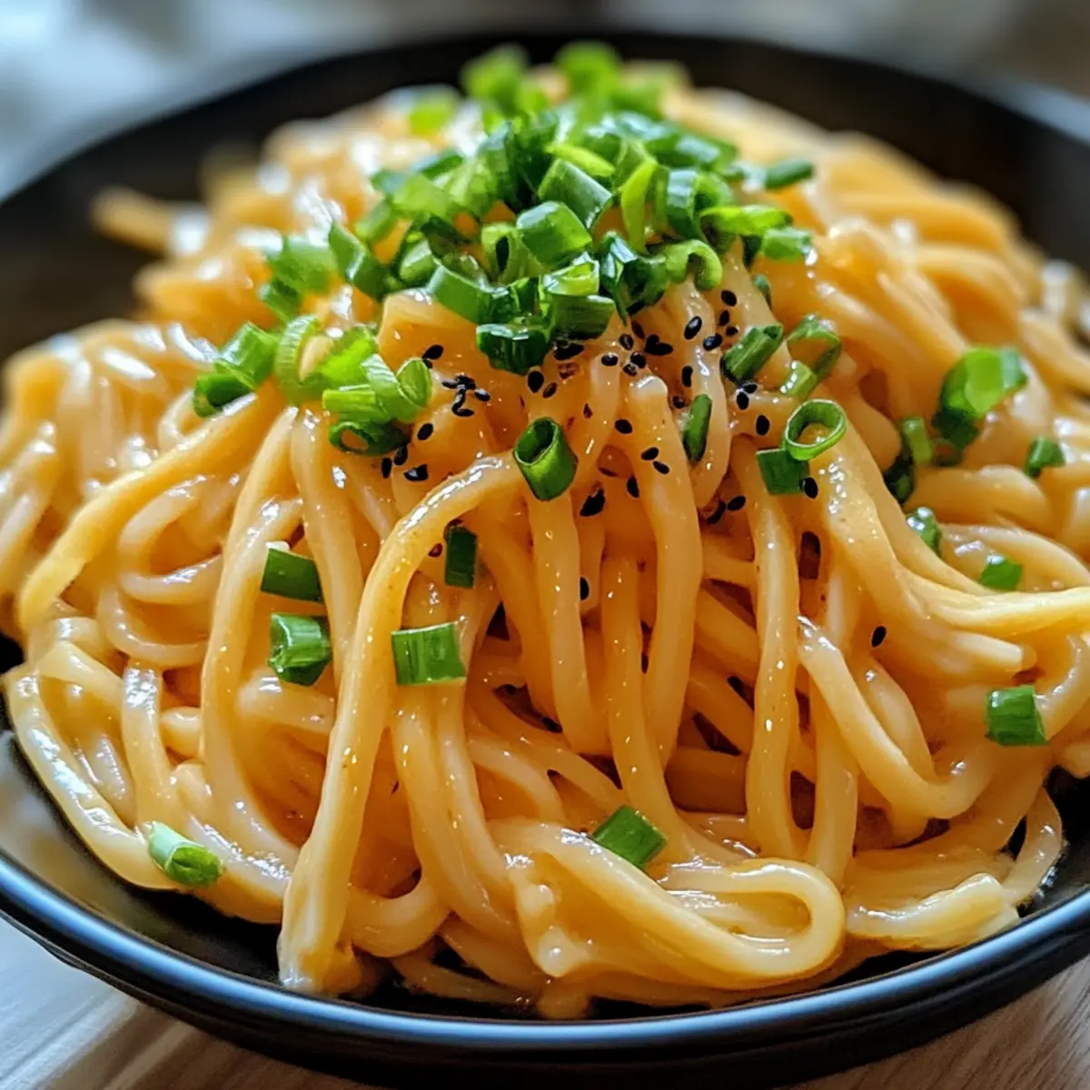 - Serviere die Nudeln warm, garniere mit Frühlingszwiebeln und Sesamkörnern.