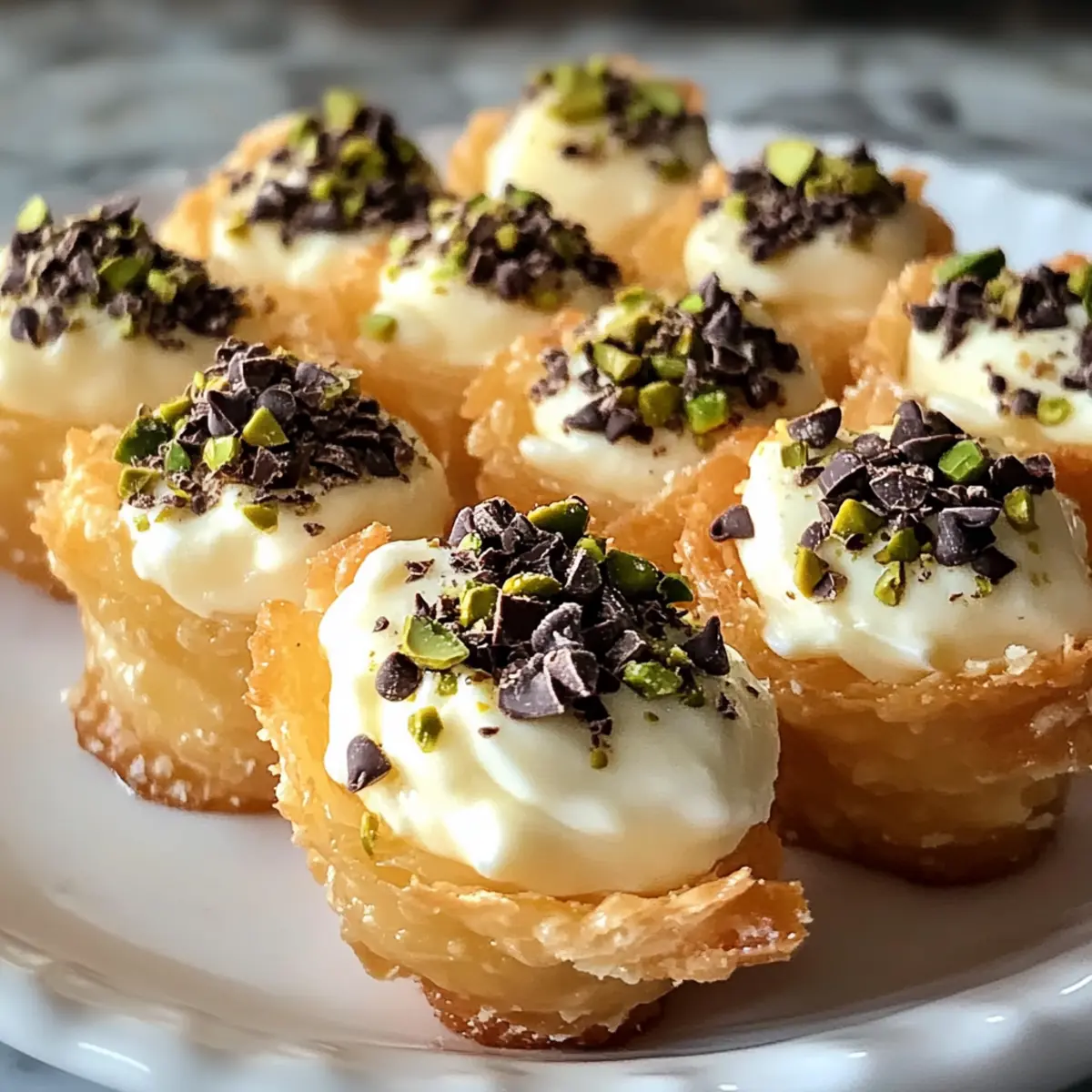 - Servieren und garnieren: Bestreue die gefüllten Cannoli Bissen mit Schokoladensplittern oder gehackten Pistazien und serviere sie sofort.