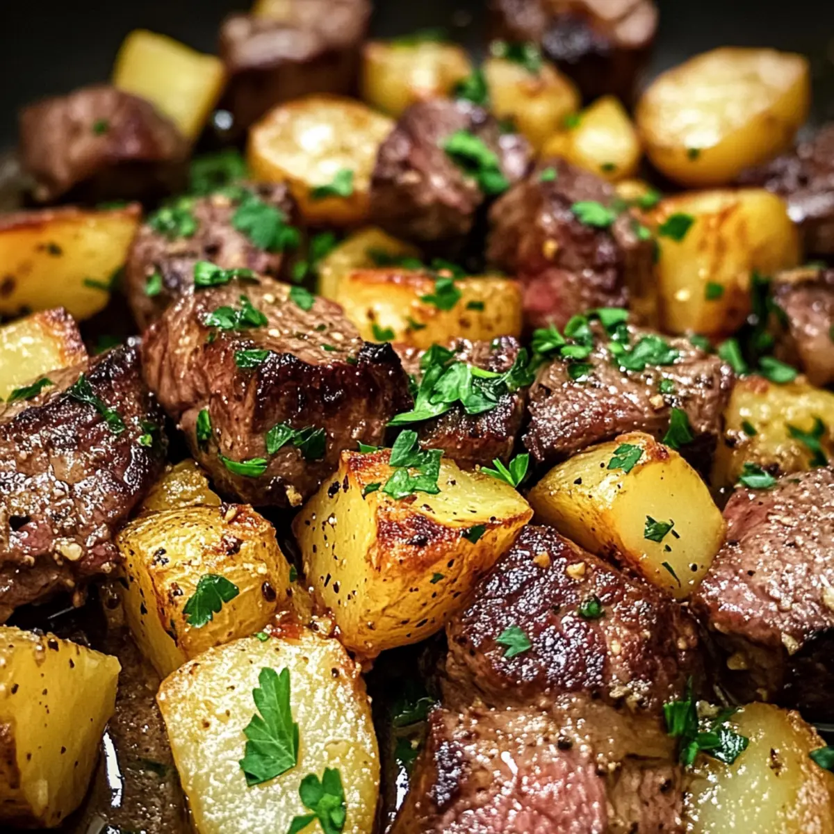 Cremige Knoblauchbutter Steakstücke und Kartoffeln schnell zubereiten