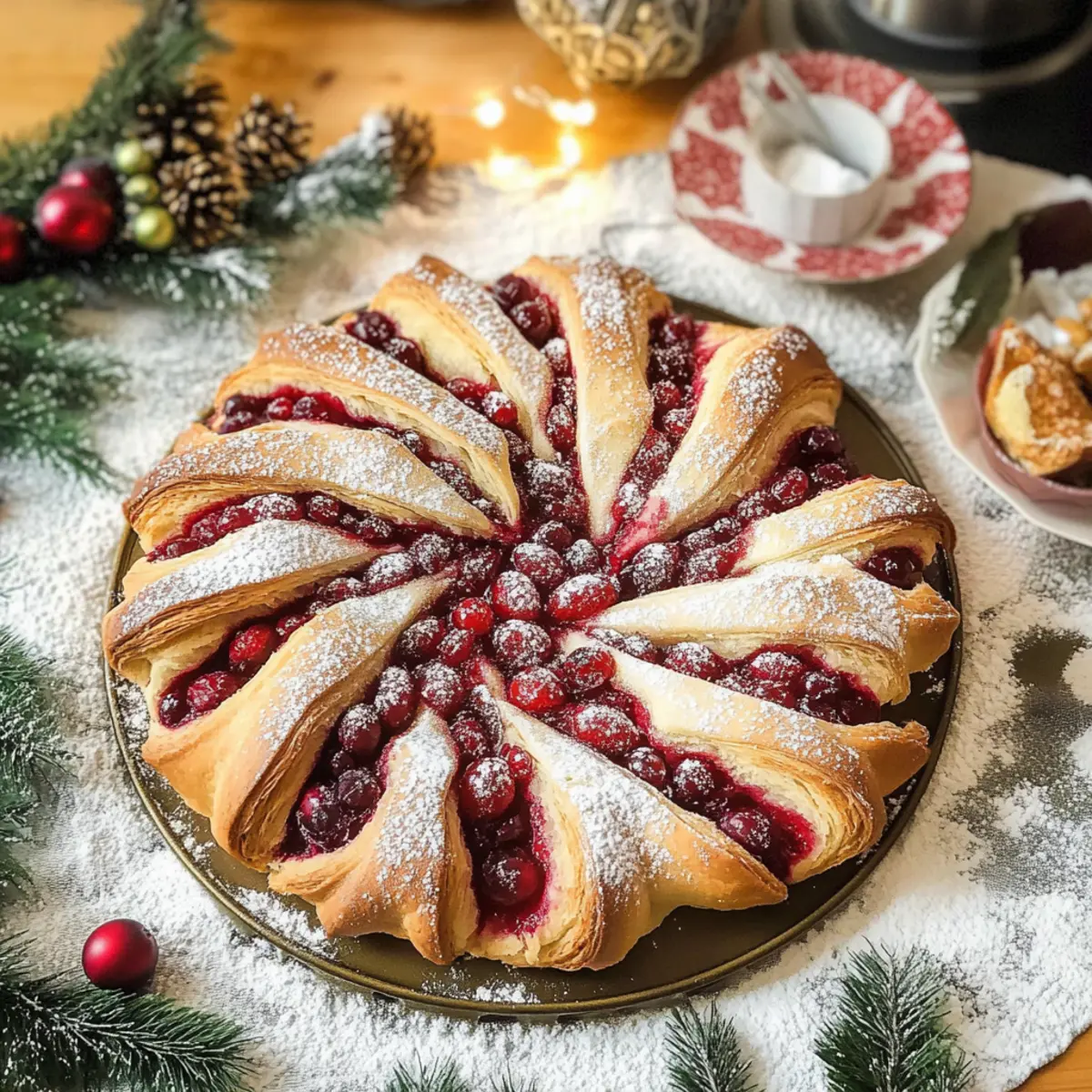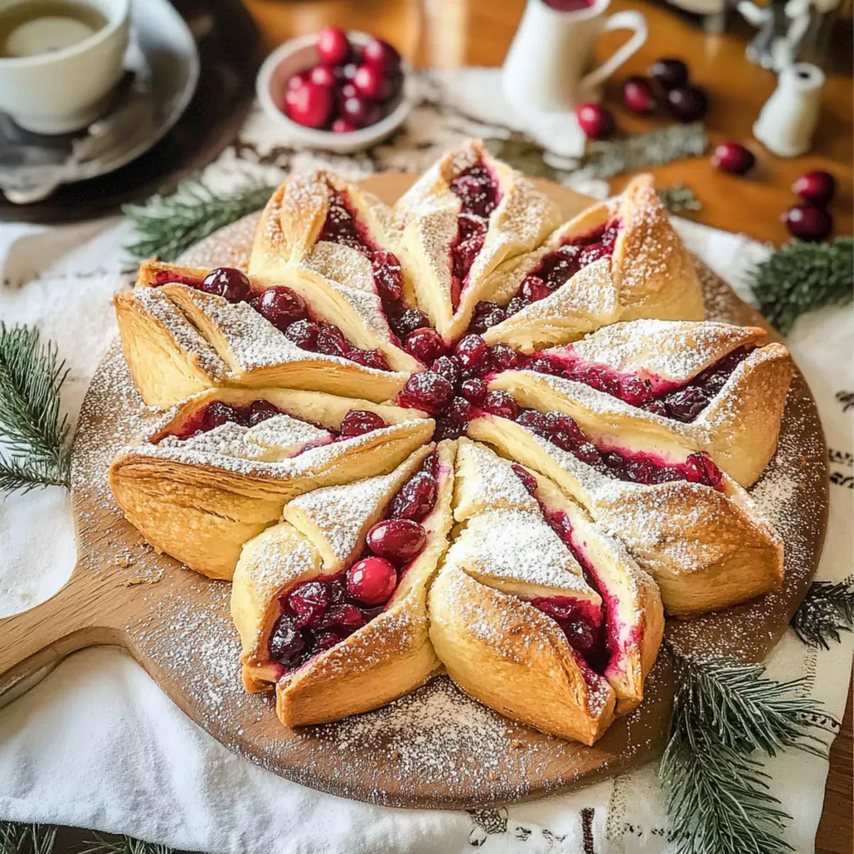 Bestäube das gebackene Cranberry Sternbrot großzügig mit Puderzucker, bevor du es servierst. Du könntest auch essbare Blüten oder frische Cranberries für eine festliche Note hinzugefügt werden. Mangelt es an Zeit, kannst du das Brot auch auf einem dekorativen Teller anrichten und mit einem schönen Tuch umhüllen.