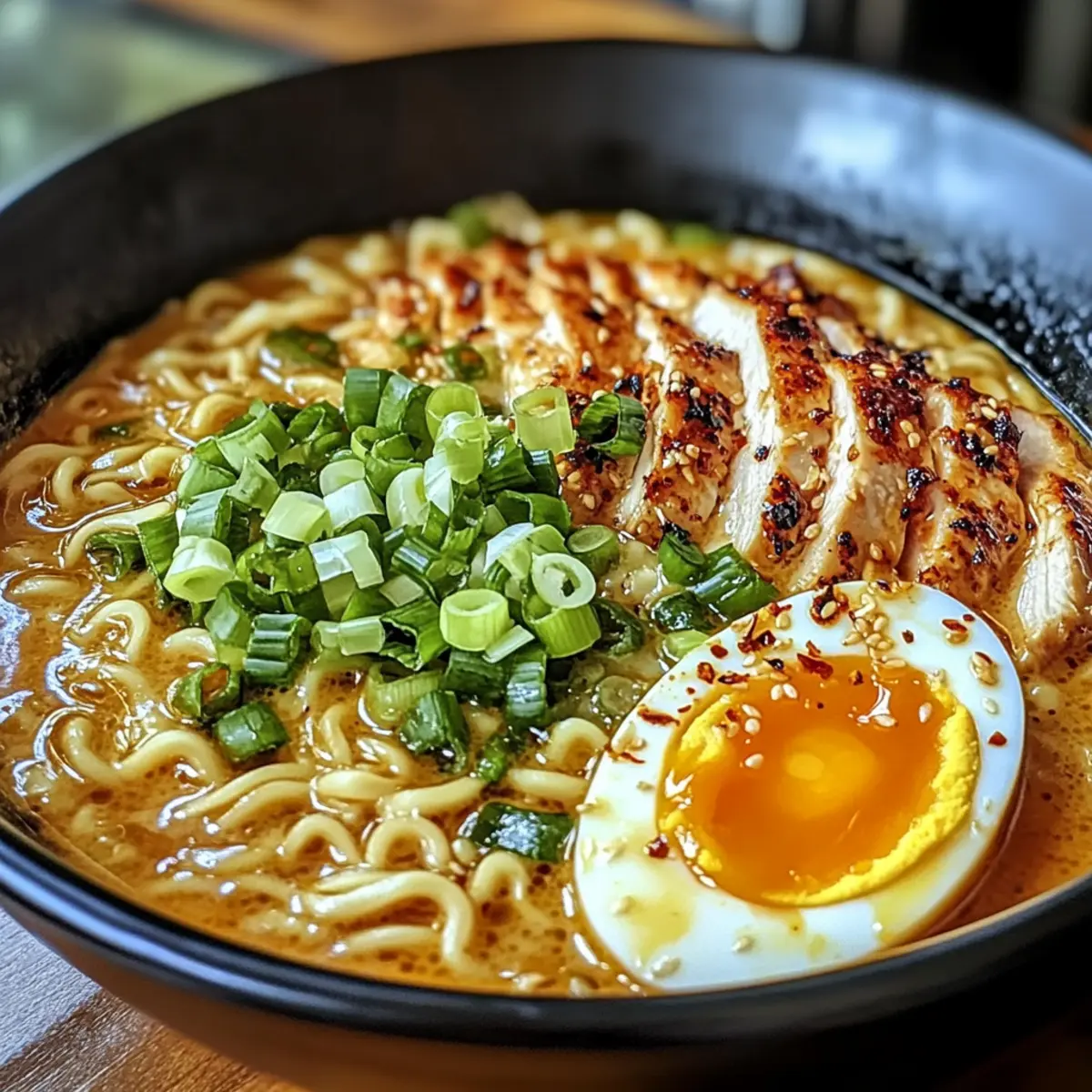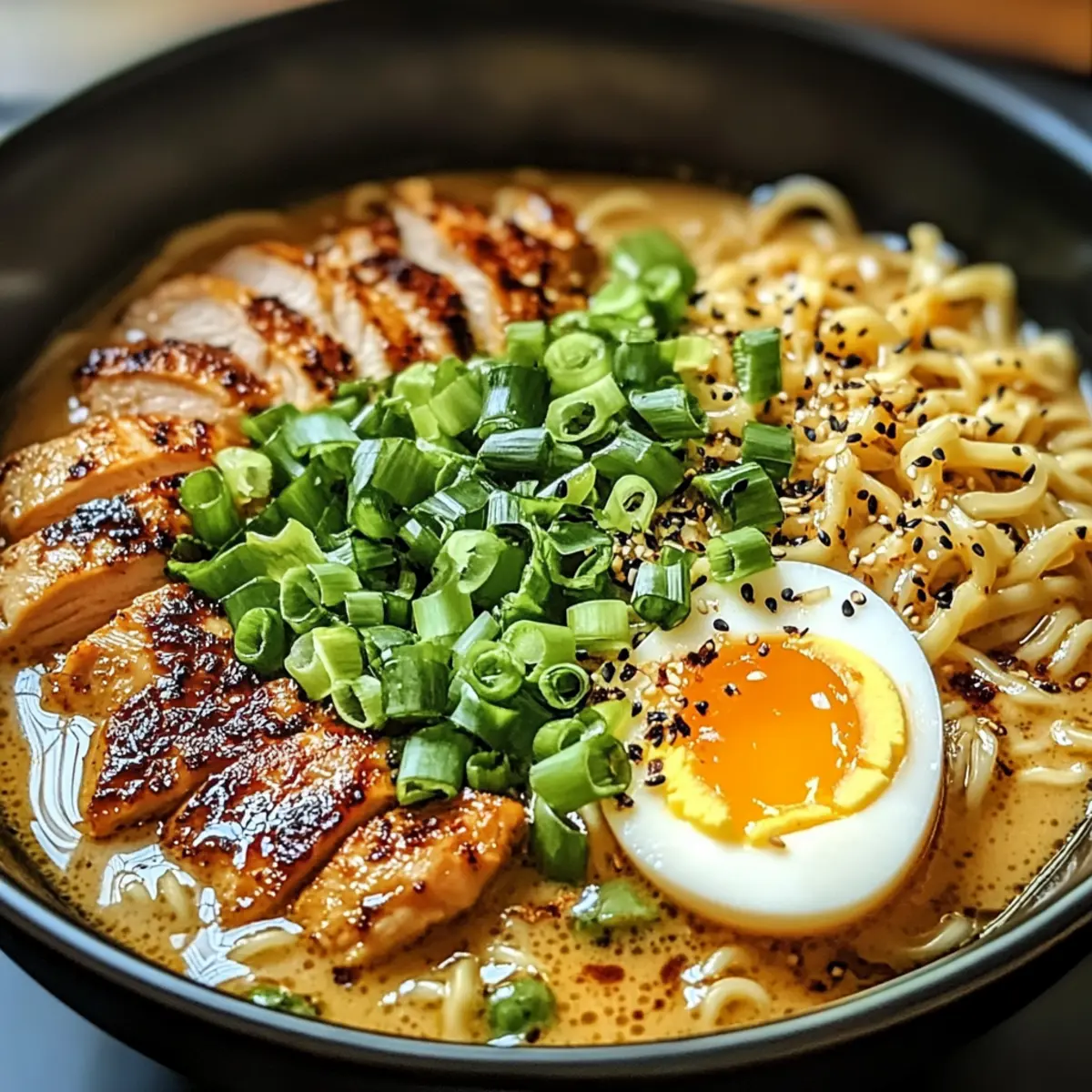 Schneide das Hähnchen in Streifen und lege es auf die Nudeln in den Schalen. Garniere das Gericht mit frisch geschnittenen Frühlingszwiebeln und, falls gewünscht, mit weichgekochten Eiern für extra Geschmack und Cremigkeit. Jetzt ist dein feuriges Chicken Ramen mit cremiger Knoblauchsauce bereit, serviert zu werden!