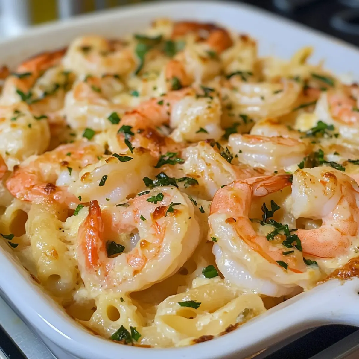 Nehme die Garnelen Scampi Pasta aus dem Ofen und lasse sie kurz abkühlen. Garniere sie mit frisch gehackter Petersilie für einen Farbtupfer und zusätzlichen Geschmack. Jetzt ist sie bereit zum Servieren!