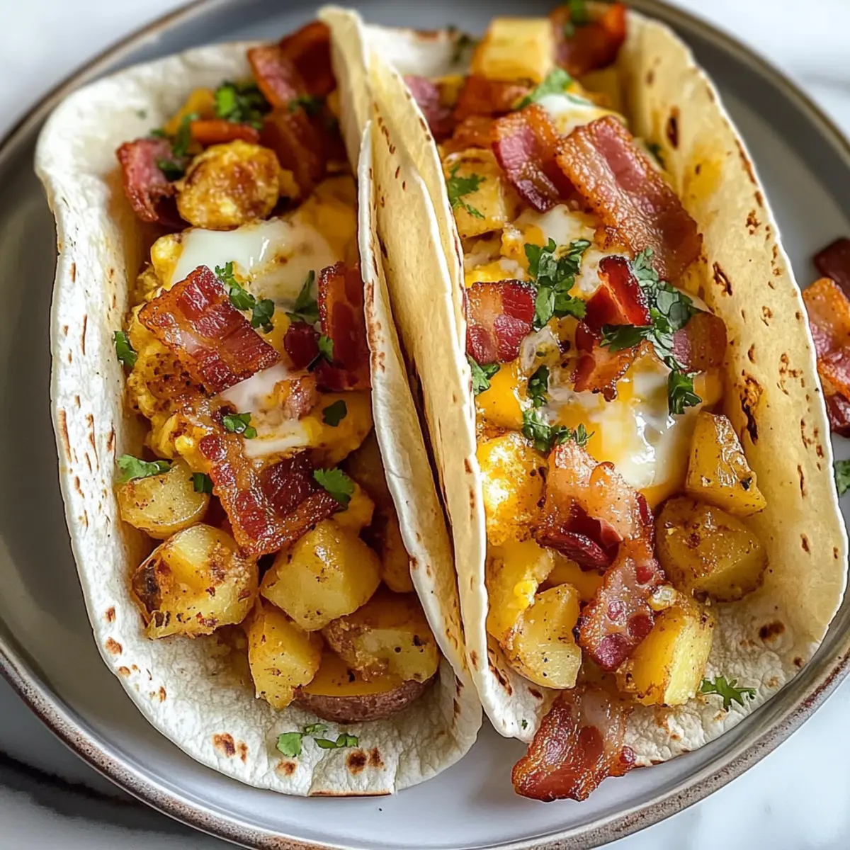 Erschaffe dir einen stressfreien Morgen mit der Vorbereitung der gebratenen Frühstückstacos bis zu 24 Stunden im Voraus! Du kannst die Kartoffeln bereits am Vortag braten und im Kühlschrank aufbewahren, was ihre Qualität erhält und den zeitlichen Aufwand am Morgen minimiert. Auch der Speck kann vorgegart und in Stücke geschnitten werden; so sparst du wertvolle Minuten. Am nächsten Morgen musst du nur noch die Eier leicht anrühren sowie die Füllung in die Tortillas geben und diese backen – das dauert nur 15-20 Minuten, um alles zu verbinden. Für die beste Textur, lagere die gefüllten Tacos nicht länger als 3 Tage im Kühlschrank und backe sie direkt nach dem Füllen im Ofen. So bleiben sie einfach köstlich!