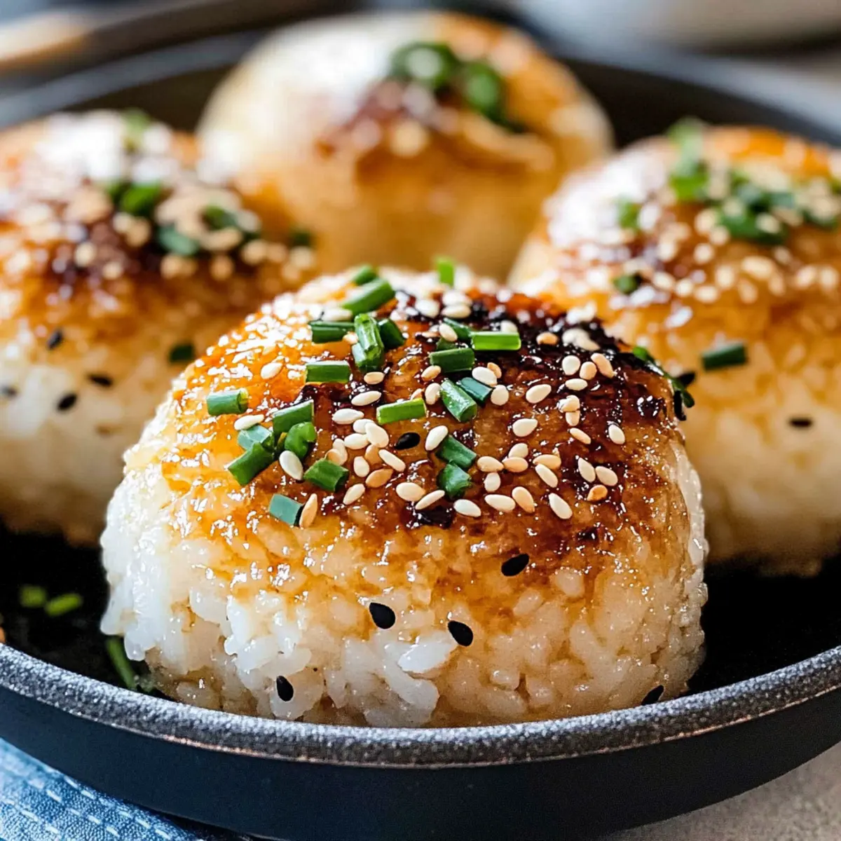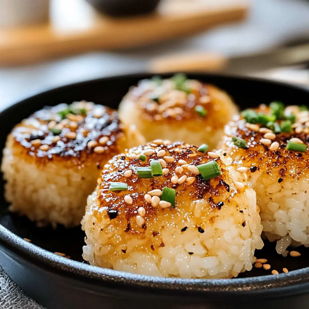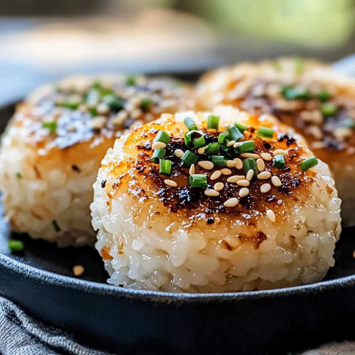 Servieren für den Geschmack: Ergänze die gegrillten Onigiri mit frischen Zutaten wie Schnittlauch oder Sesam, um jede Biss zu verfeinern.