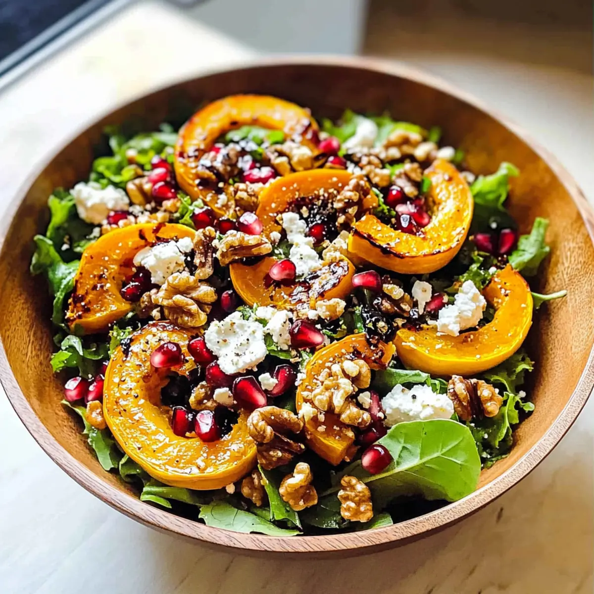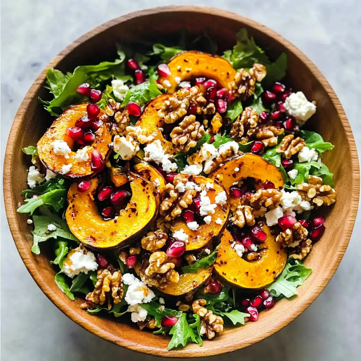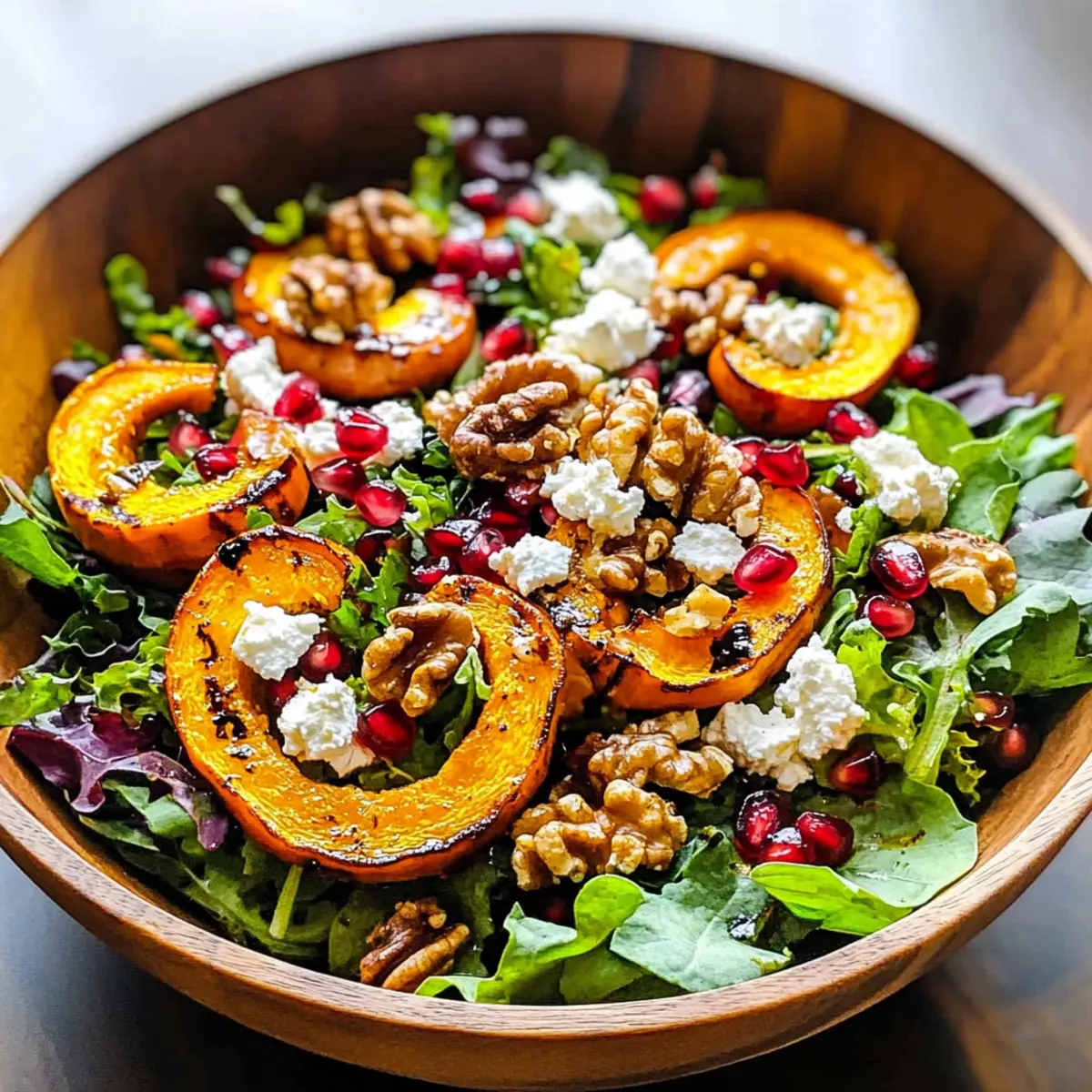 - In einer großen Salatschüssel frische Salatblätter und gekochten Bulgur oder Quinoa kombinieren. Warme Kürbisscheiben, Granatapfelkerne, gehackte Walnüsse und zerbröckelten Ziegenkäse hinzufügen. Vorsichtig mischen, damit die Kürbisse nicht zerdrückt werden.