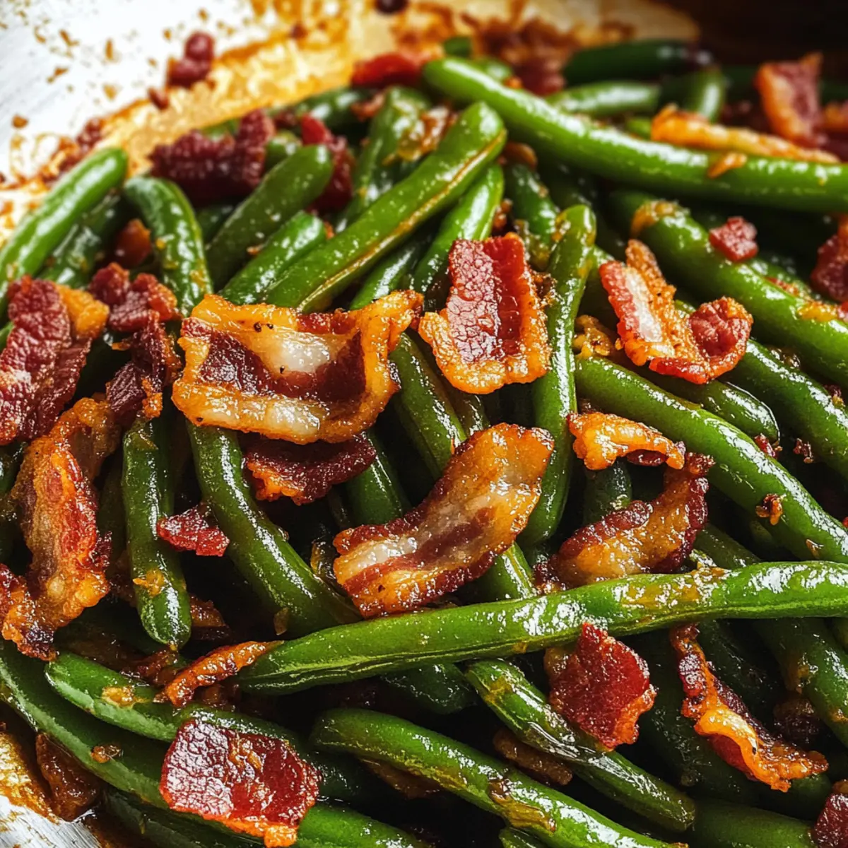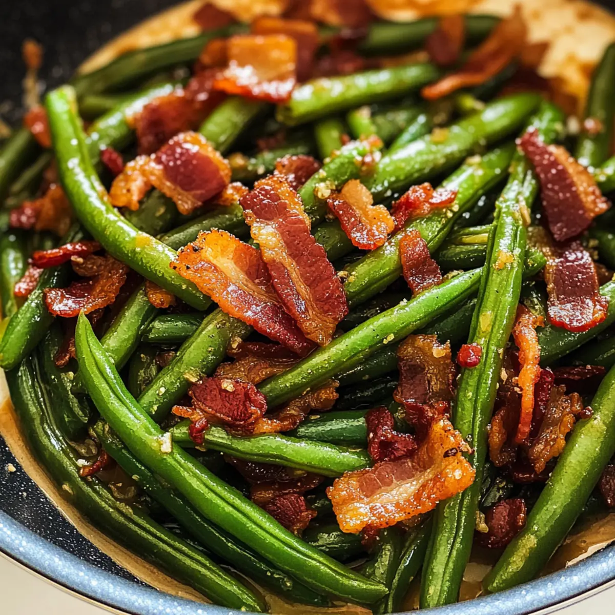 - Nehme die Pfanne von der Hitze, und gib den knusprigen Speck zurück zu den sautierten grünen Bohnen. Mische alles gut, sodass die Bohnen gleichmäßig mit der süß-salzigen Sauce und dem Speck umhüllt sind.