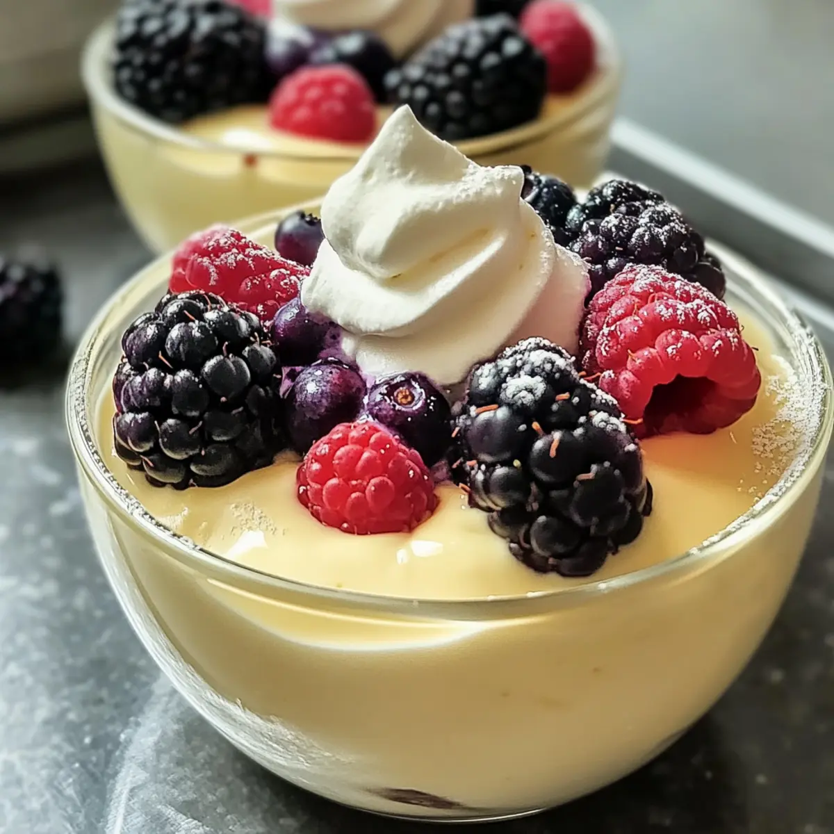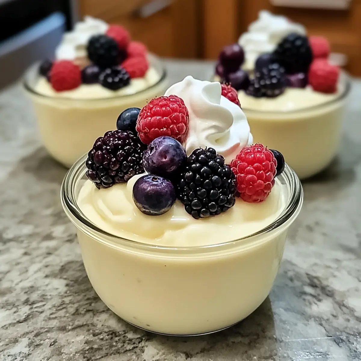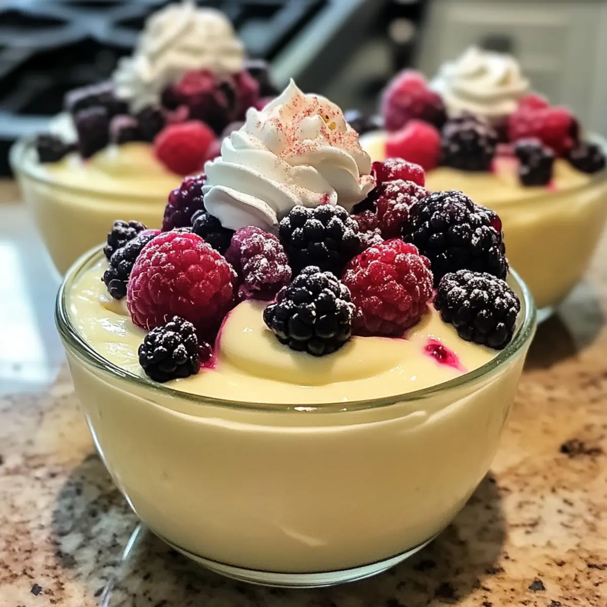 Verteile den Pudding gleichmäßig auf Servierbecher und fülle sie bis zu drei Viertel voll. Jetzt kannst du kreativ werden: Füge deine gewünschten Toppings hinzu, wie erwärmte gemischte Beeren oder einen Klecks Schlagsahne. Diese verfeinern den Pudding und sorgen für einen zusätzlichen Geschmacksbonus.