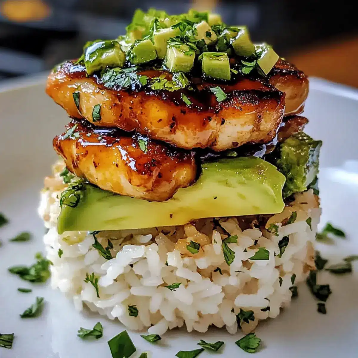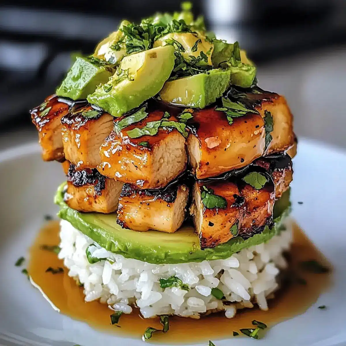Verwende einen Ringformer oder Ausstecher, um den Reis gleichmäßig auf den Tellern zu schichten, gefolgt von einer Lage des glasierten Hähnchens und schließlich den Avocadoscheiben. Ein zusätzlicher Spritzer frischer Limettensaft über das gesamte Gericht sorgt für einen zusätzlichen Frischekick. Plane eventuell etwas frischen Koriander als Garnierung ein, um das Gericht optisch zu beleben.