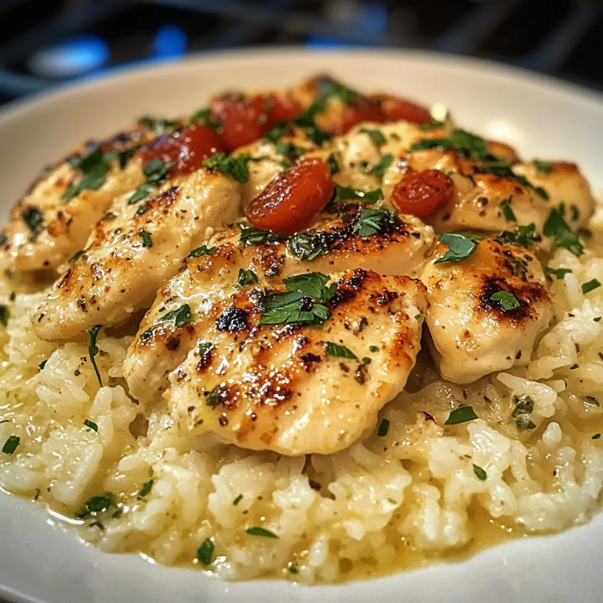 - Serviere die Hähnchenbrust über dem Reis und löffle die Sauce darüber. Dekoriere nach Belieben.