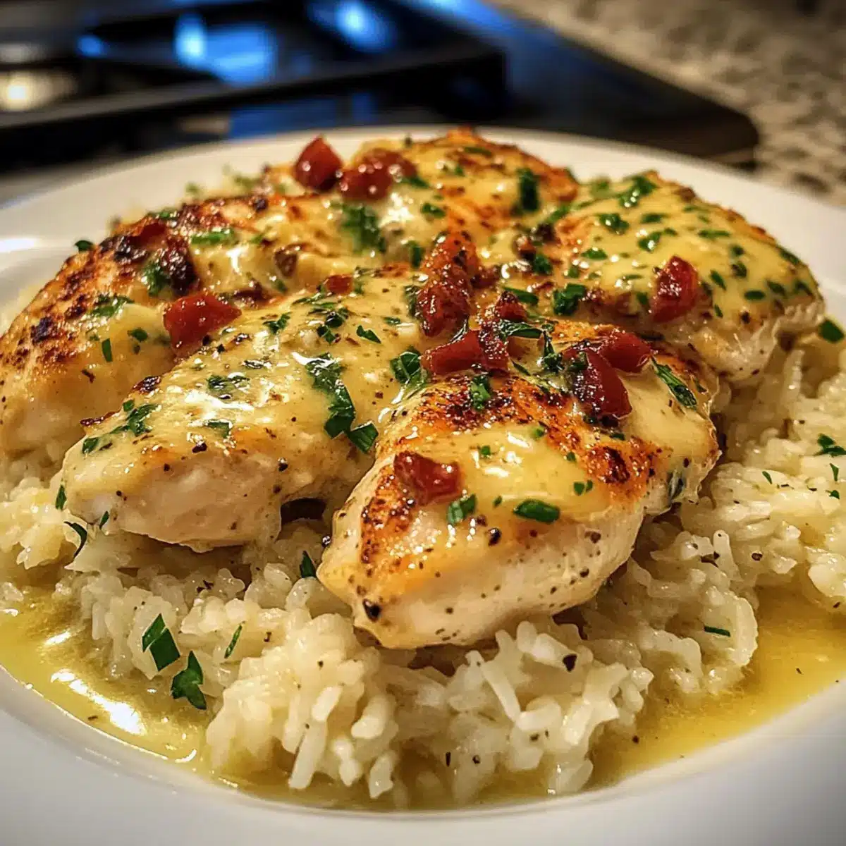 Serviere die Hühnchenbrust über dem Knoblauch Parmesan Reis und löffle die restliche Sauce darüber. Dekoriere das Gericht nach Belieben mit zusätzlicher Petersilie und optionalen roten Pfefferflocken für einen Hauch von Schärfe. Dieses Hühnchen Scampi mit Knoblauch Parmesan Reis wird sicher alle begeistern!