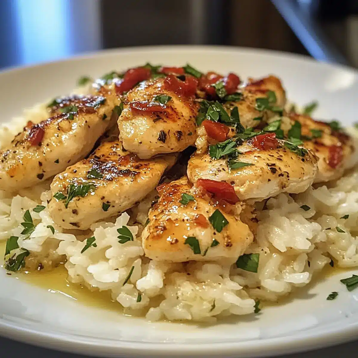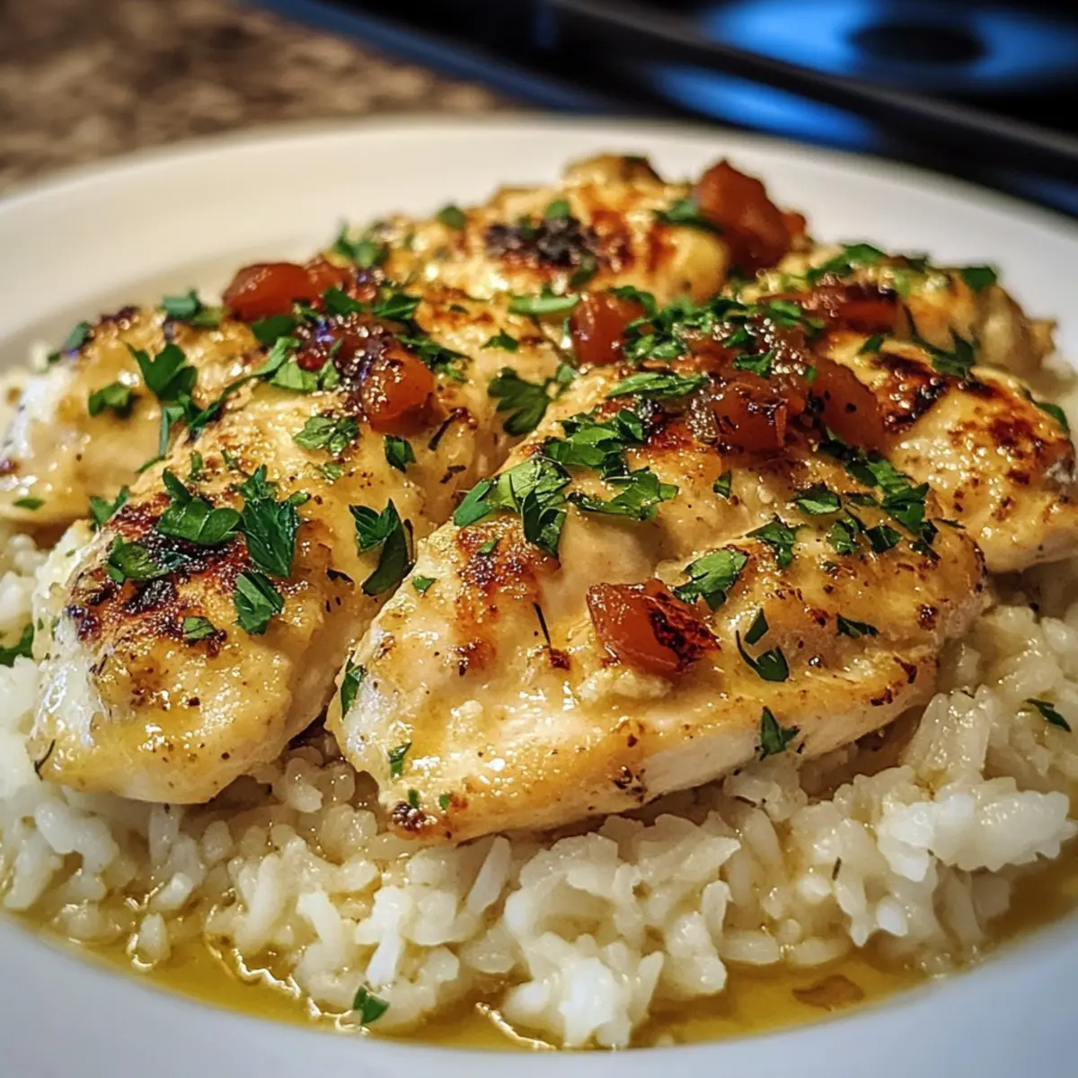 Servieren Sie das Hühnchen auf einem Bett von Knoblauch Parmesan Reis und löffeln Sie die köstliche Sauce darüber. Garnieren Sie das Gericht nach Belieben mit zusätzlicher Petersilie und roten Paprikaflocken für eine pikante Note. Genießen Sie dieses herzliche und aromatische Mahlzeit!