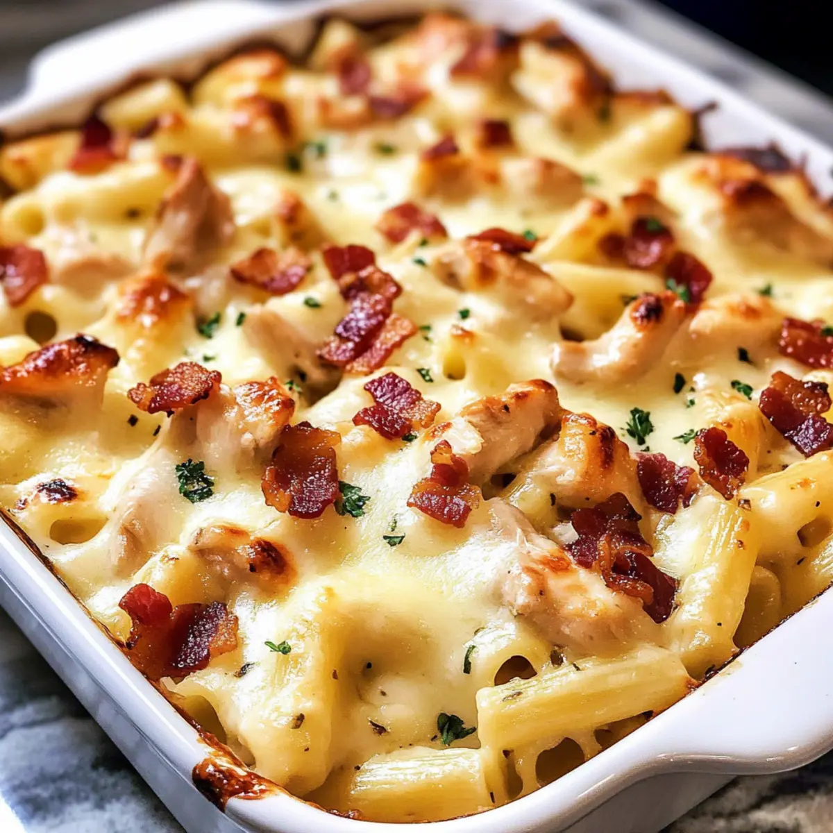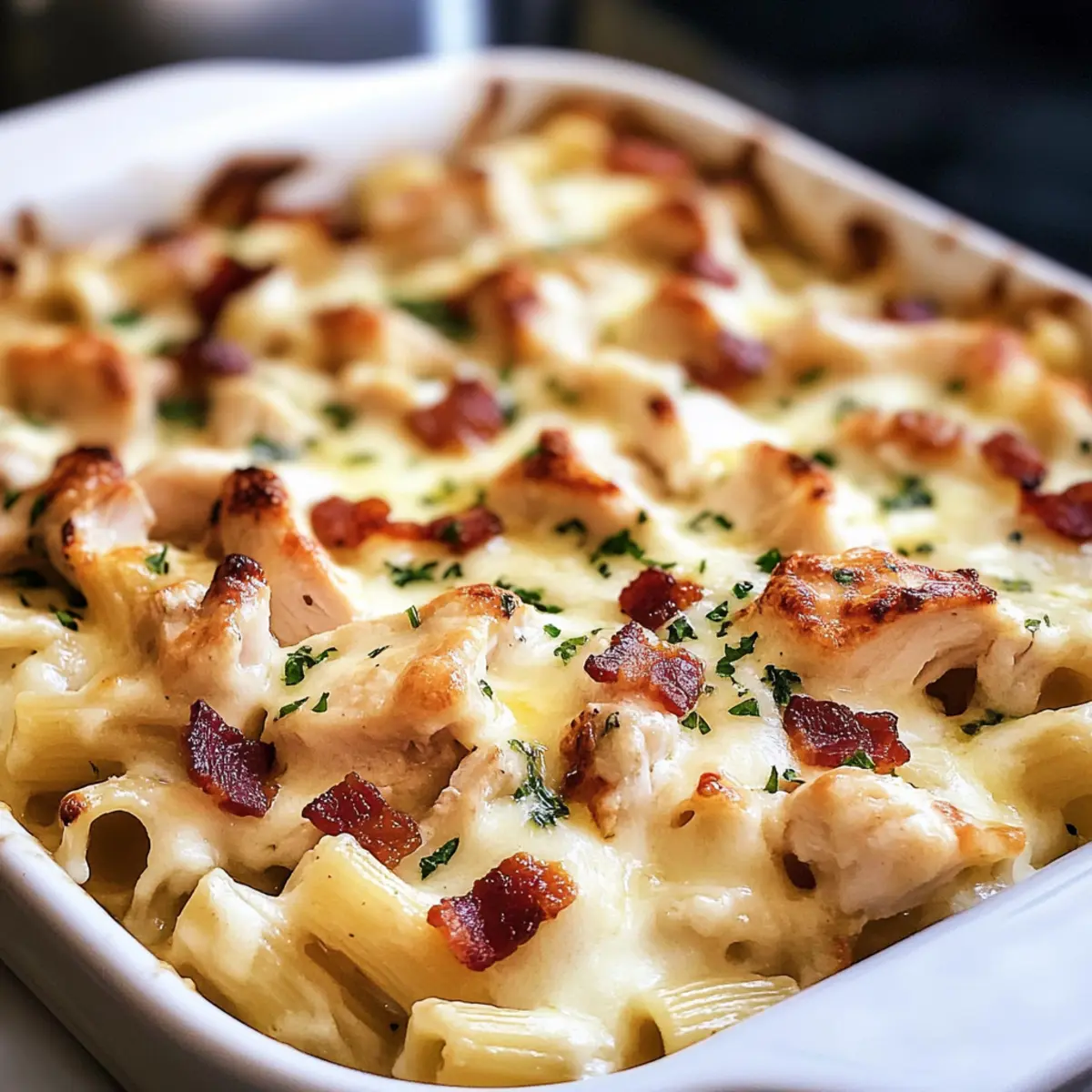 Fette ein 9×13 Zoll großen Auflaufform mit etwas Butter ein. Gieße die Mischung aus Pasta, Hähnchen und Soße gleichmäßig in die Form. Verteile den geriebenen Mozzarella und den gekochten Bacon gleichmäßig über die Oberseite für einen köstlichen, goldbraunen Abschluss.
