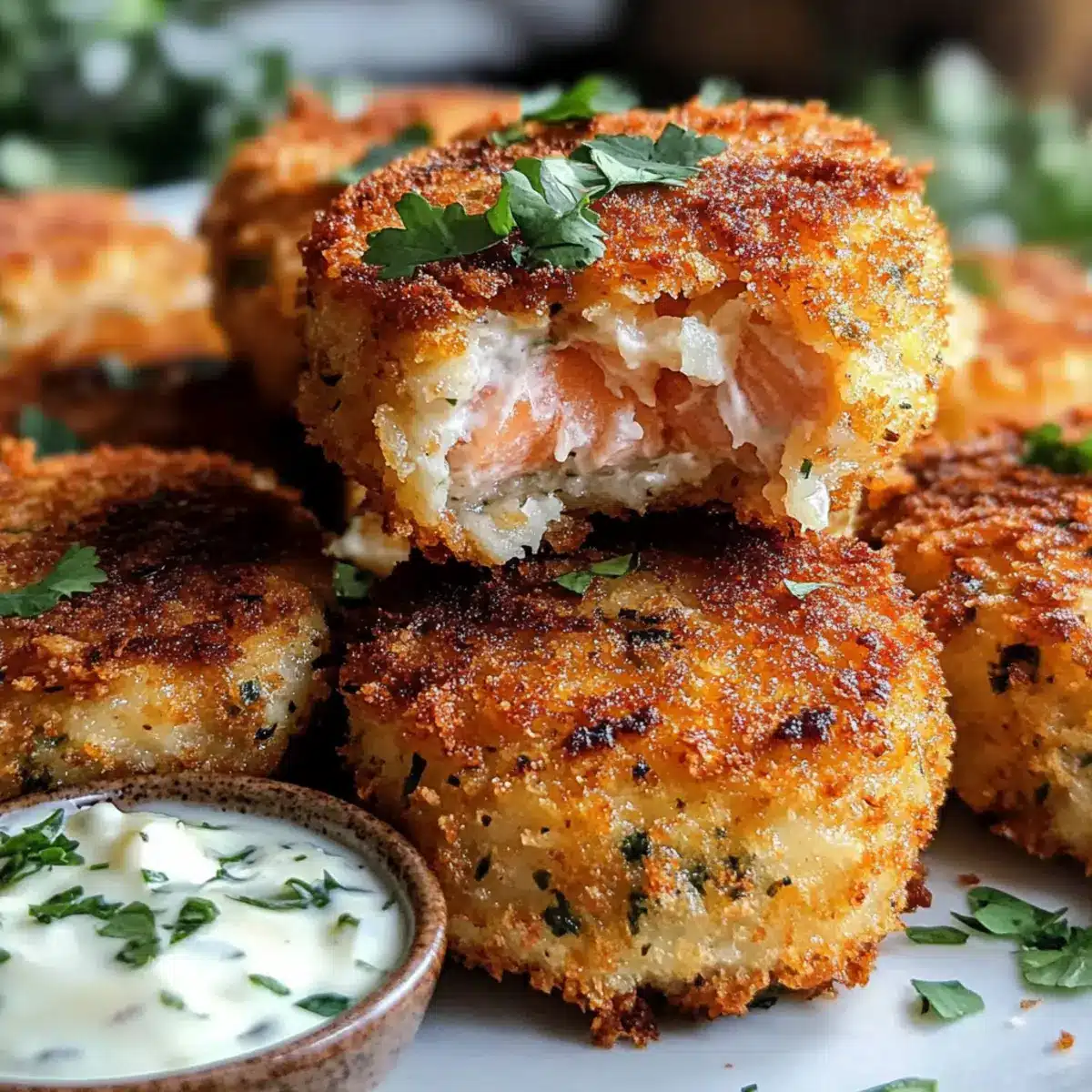Sobald die Knusprigen Lachsfrikadellen goldbraun und knusprig sind, nimm sie aus der Pfanne oder dem Ofen und lasse sie kurz abkühlen. Serviere sie warm mit Dips wie Remoulade, Zitronen-Aioli oder hausgemachter Tartarsauce. Diese Häppchen sind der perfekte Snack, der die ganze Familie begeistern wird!