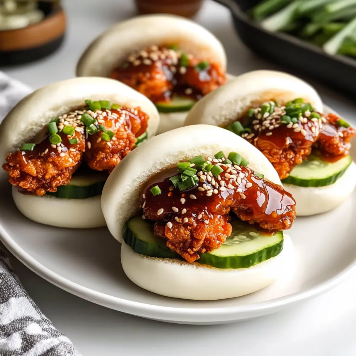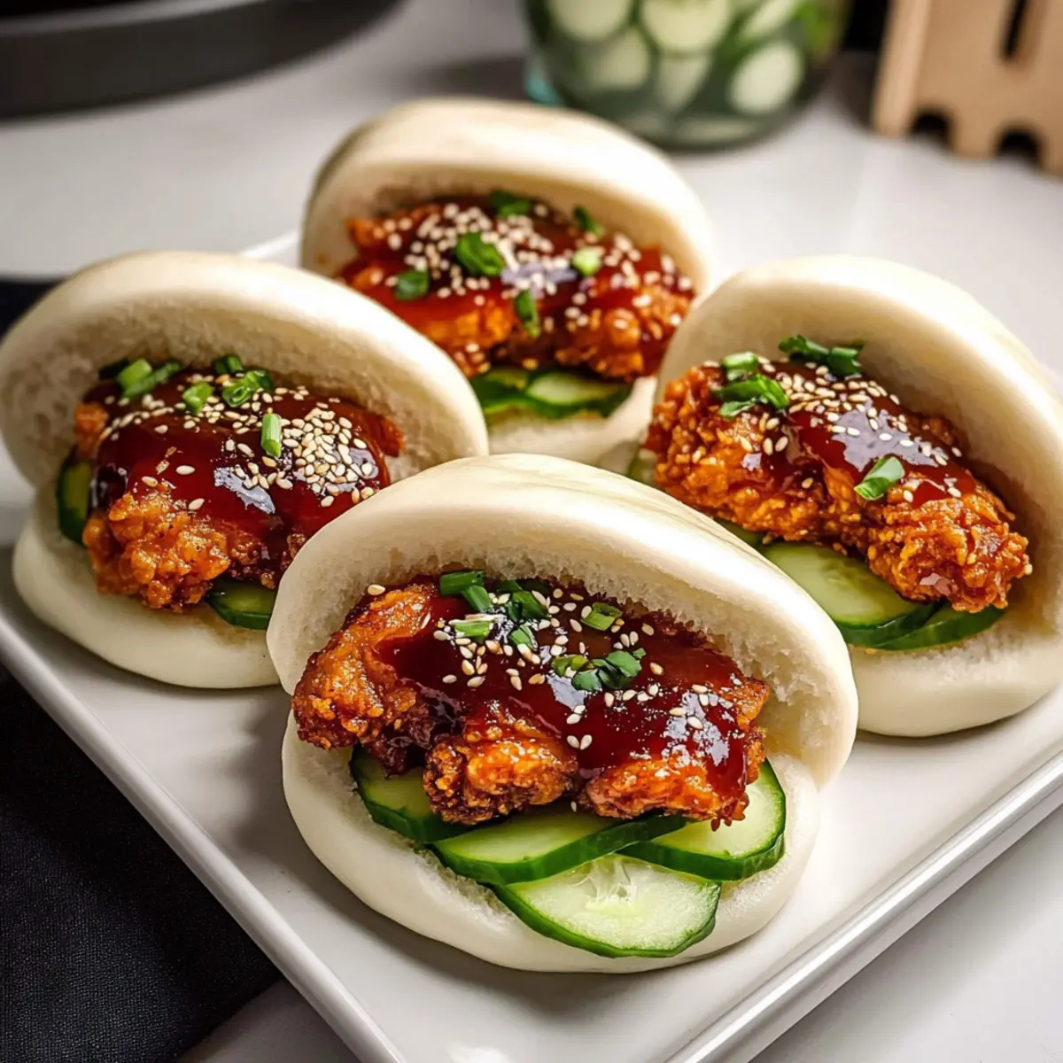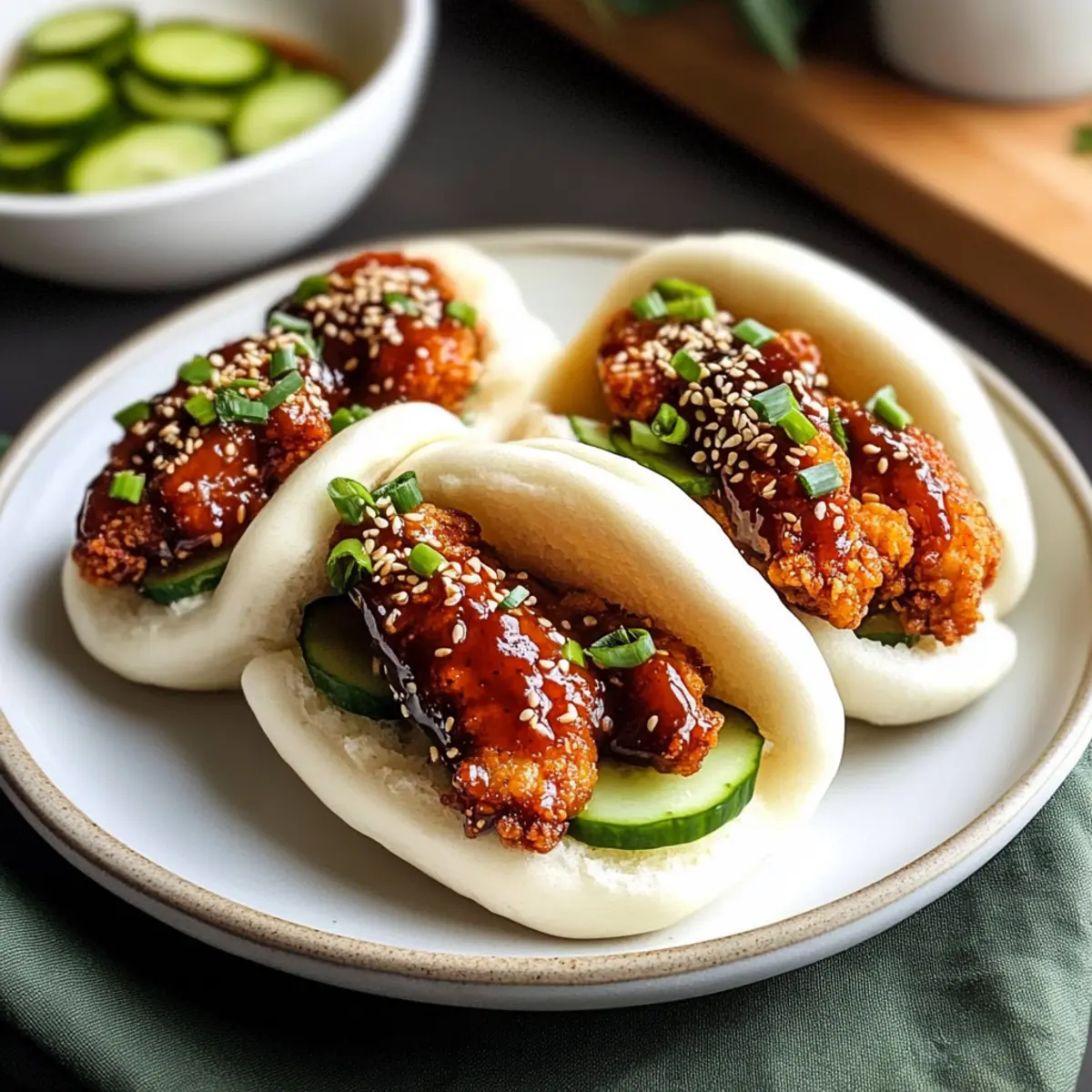 - Bao-Brötchen zusammenstellen: Öffne die Bao-Brötchen, füge Sauce und Hähnchen hinzu und garniere mit Gurke, Frühlingszwiebeln und Sesamsamen.
