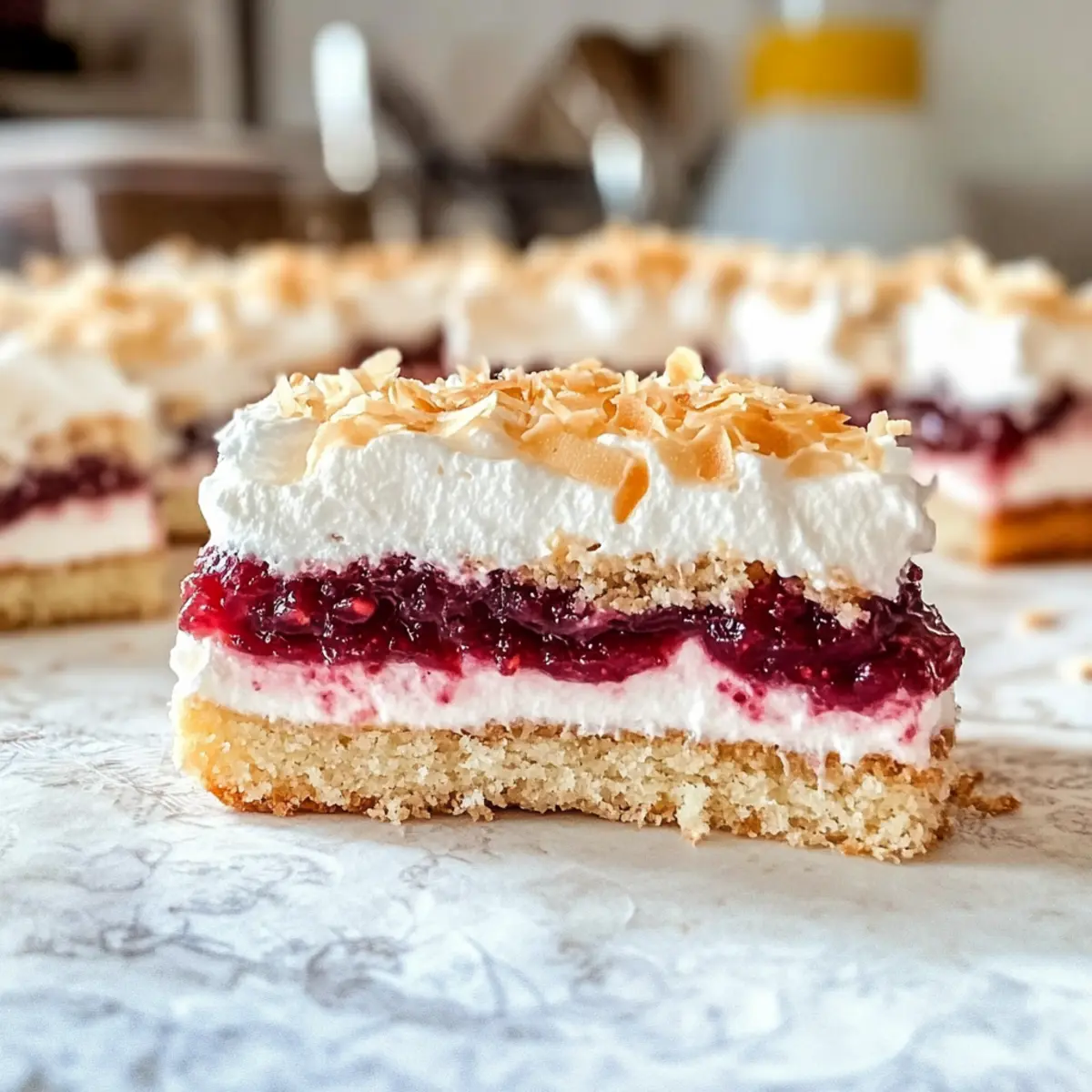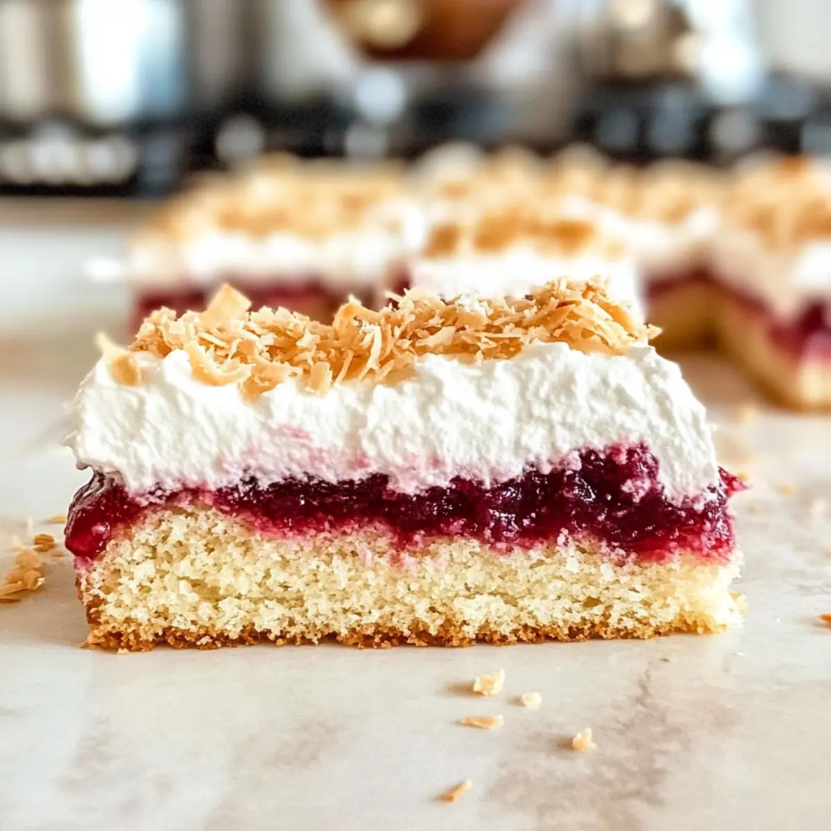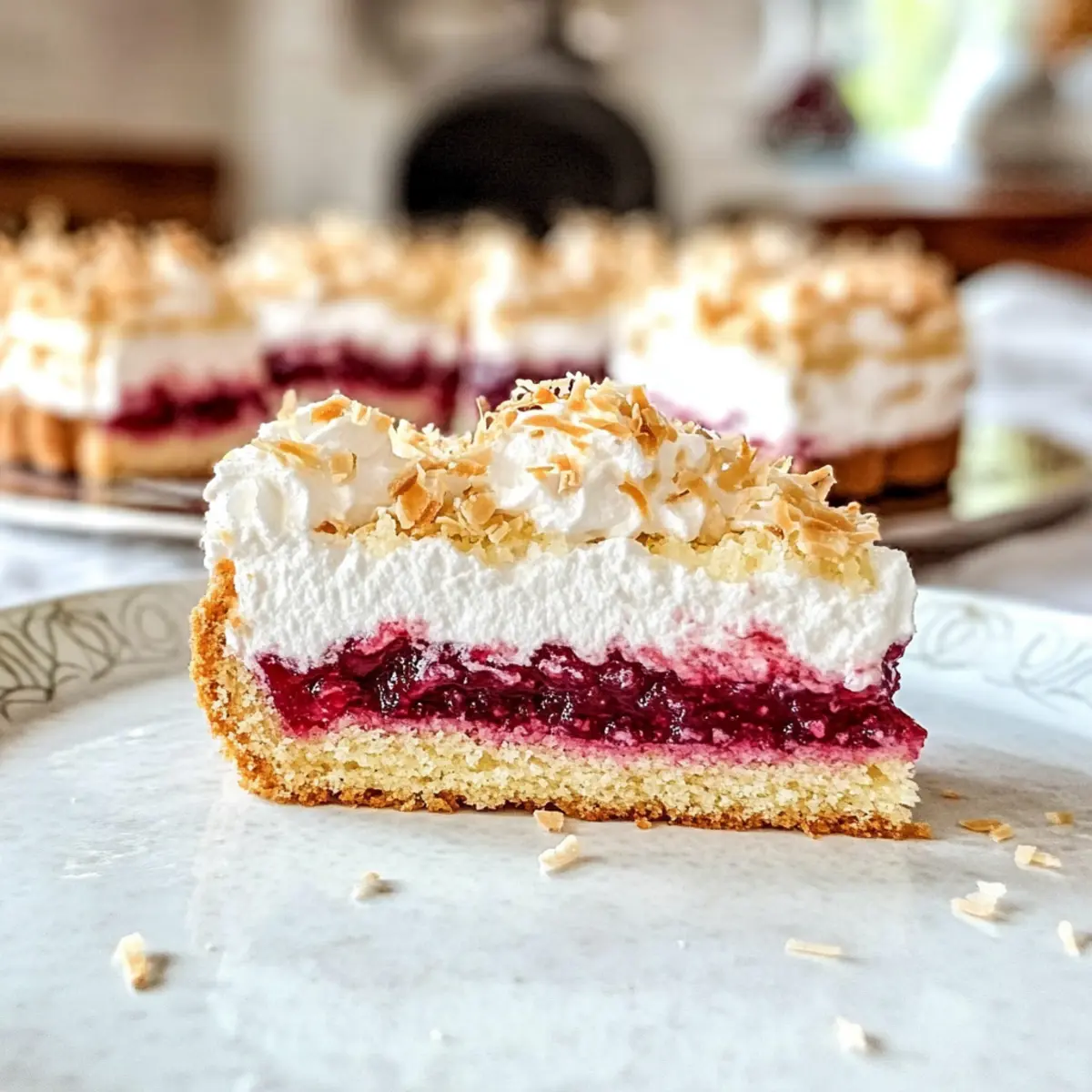 Falte die Kokosraspeln vorsichtig unter die vorbereitete Baisermasse. Achte darauf, sanft vorzugehen, damit die Luftigkeit erhalten bleibt. Diese Mischung sorgt für die einzigartige, luftige Textur, die deinen Louise-Kuchen krönt. Verteile die Baisermasse gleichmäßig auf der Himbeermarmelade, um eine schöne, glatte Oberfläche zu erzielen.