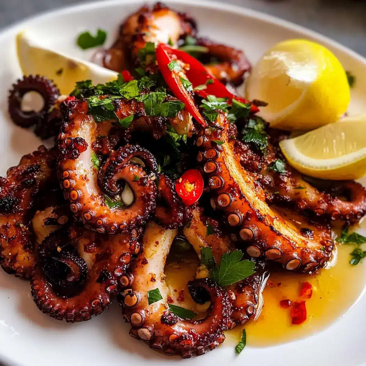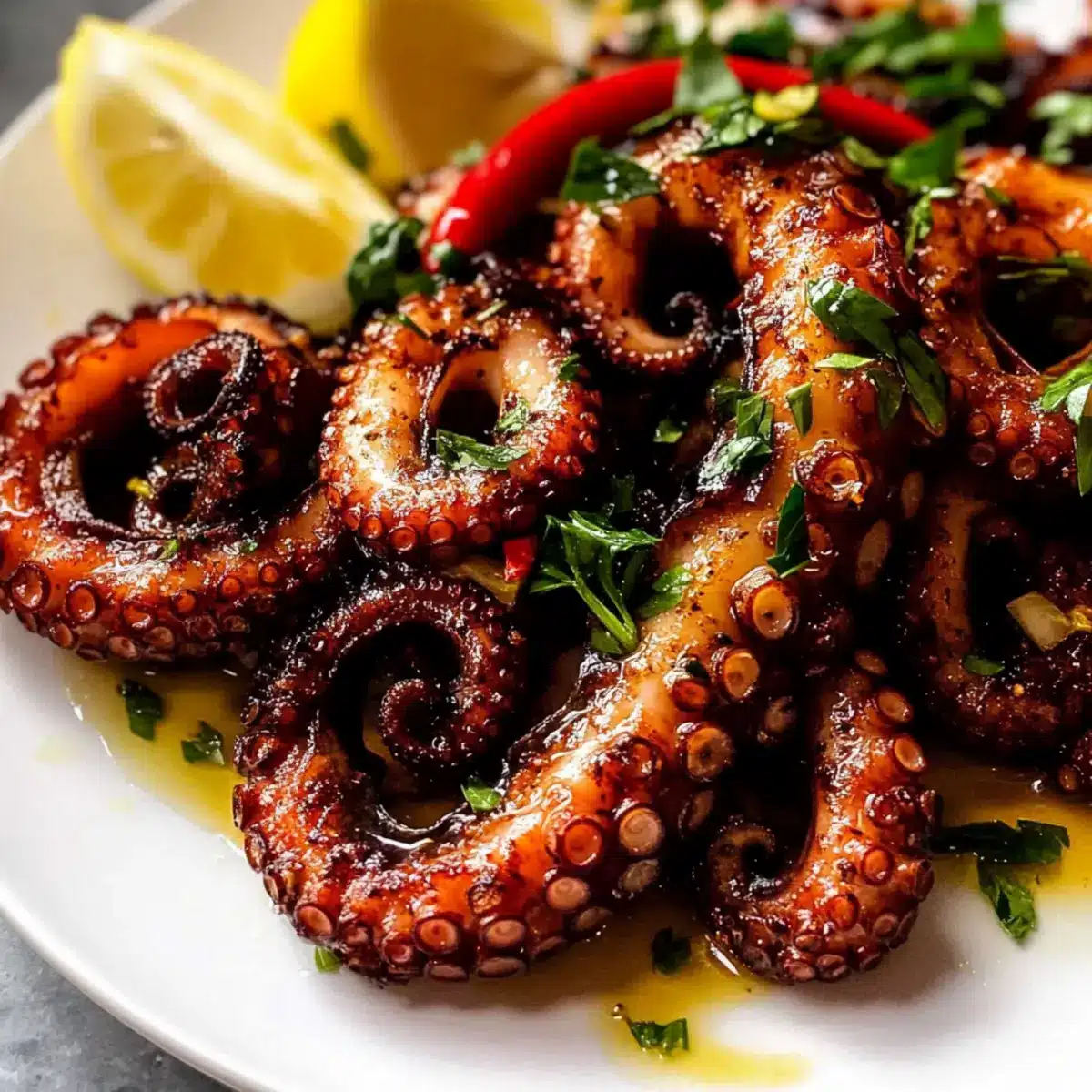 Balsamico-Essig: Verfeinere die Marinade mit einem Spritzer Balsamico-Essig, um eine süß-säuerliche Note zu integrieren. Diese Komplexität harmoniert wunderbar mit dem zarten Meerestier und verleiht ihm eine raffinierte Tiefe.