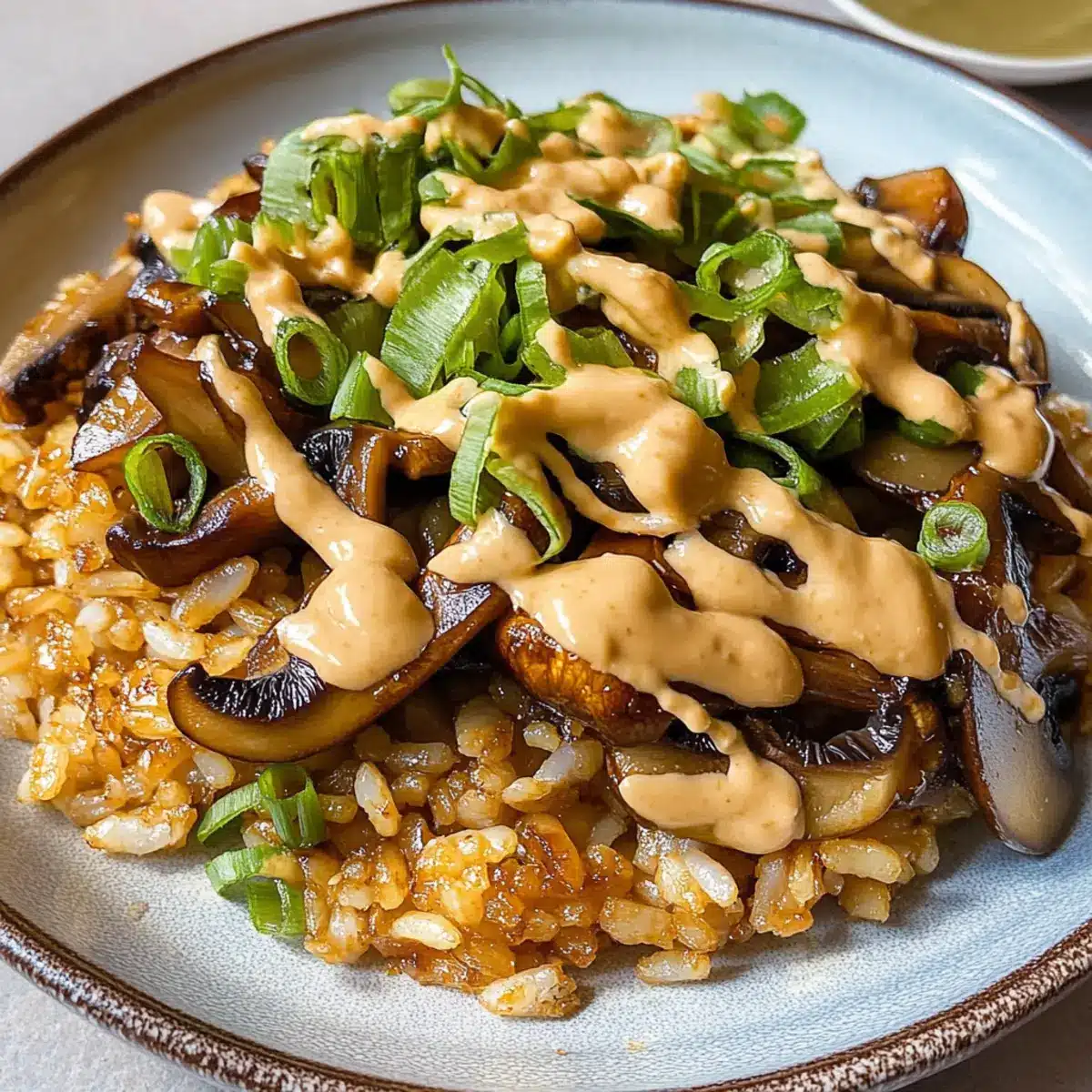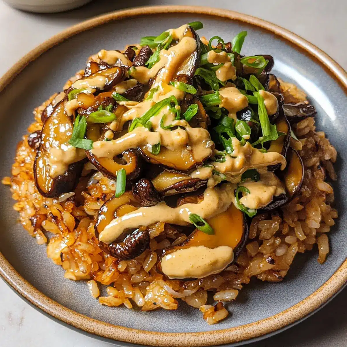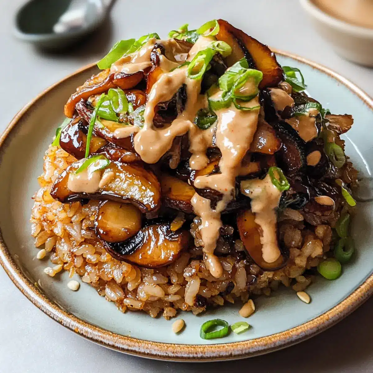 Gib den knusprigen Reis auf eine große Servierplatte und beträufle ihn großzügig mit der scharfen Miso-Mayo. Garniere das Gericht mit den restlichen geschnittenen Frühlingszwiebeln und den gerösteten Sesamkörnern. Das macht den Miso-Pilz-knusprigen Reis optisch ansprechend und noch schmackhafter.
