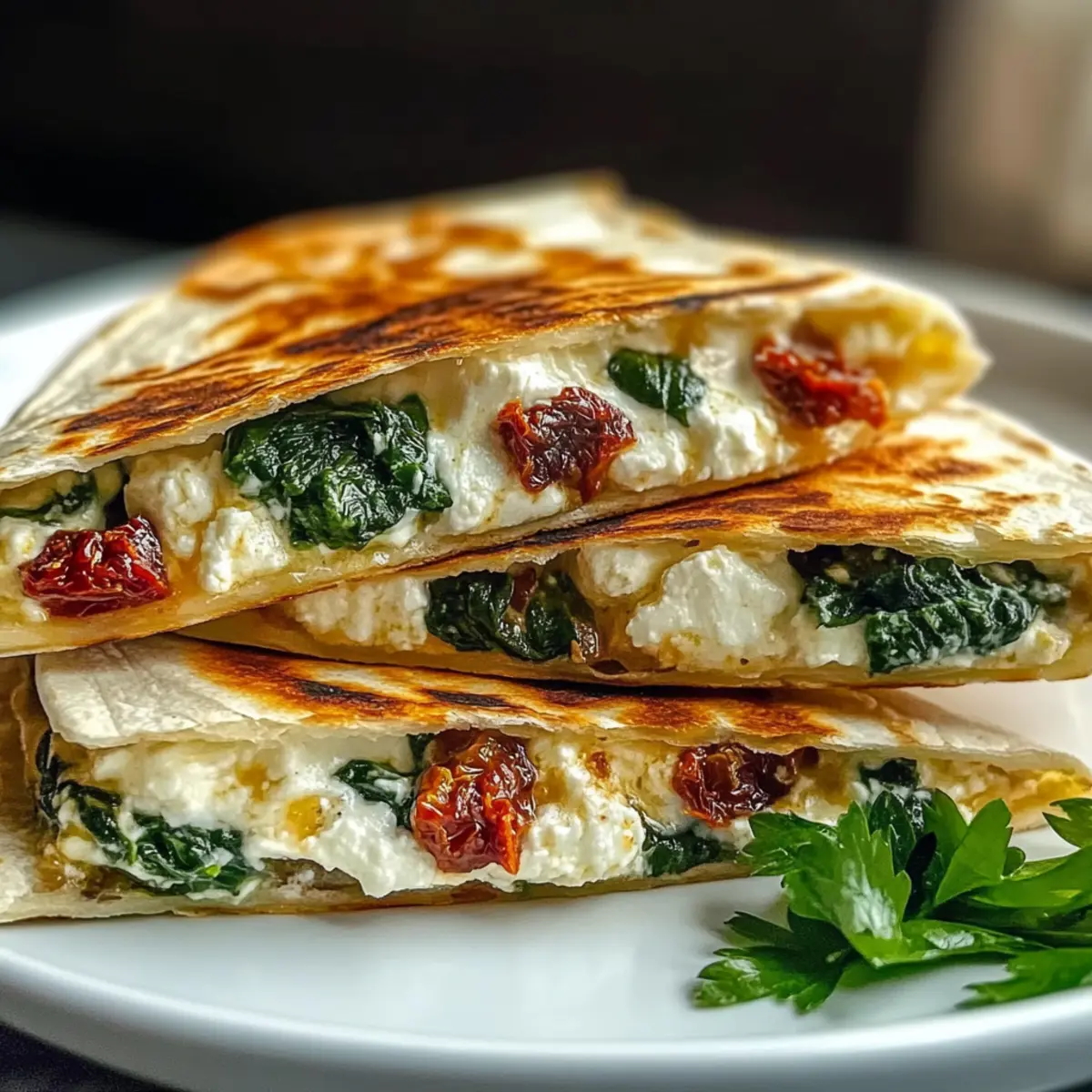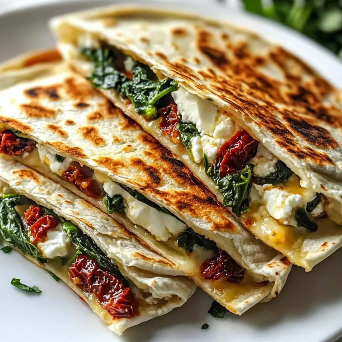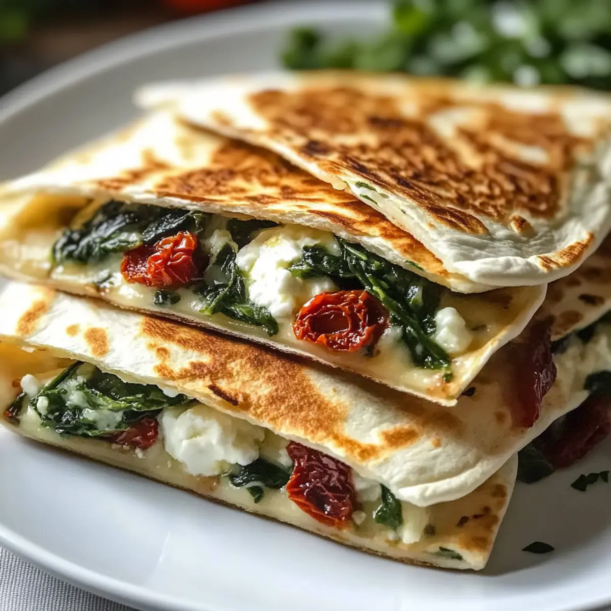 Einfachheit, Die Zubereitung dieser Mittelmeer Quesadillas erfordert nur grundlegende Kochfähigkeiten und benötigt lediglich 25 Minuten! Vielfältige Aromen, Die Kombination aus Feta, Spinat und getrockneten Tomaten entführt dich direkt an die Küste des Mittelmeers. Gesund und nahrhaft, Vollgepackt mit frischem Gemüse, bieten diese Quesadillas eine tolle Möglichkeit, gesunde Zutaten in deine Ernährung einzubauen. Vielseitig, Variiere die Füllungen nach deinem Geschmack – von köstlichen Oliven bis hin zu würzigen Paprikas. Perfekte Präsentation, Serviere die Quesadillas warm mit Rezepten wie Tzatziki oder einem frischen Salat für einen komplett mediterranen Genuss.