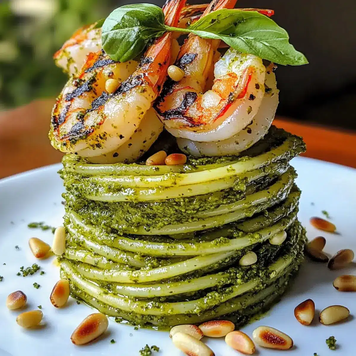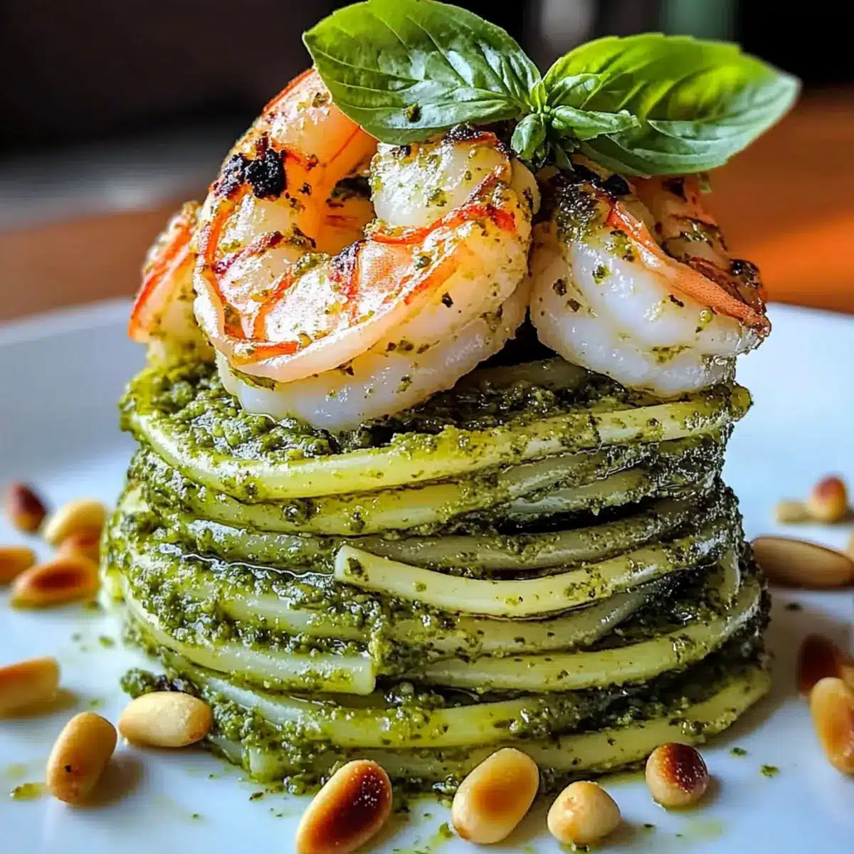 Pesto-Nudeln und gegrillte Garnelen-Stapel leicht gemacht