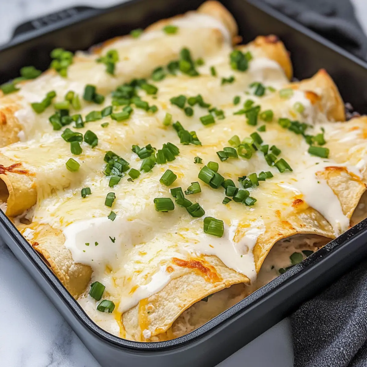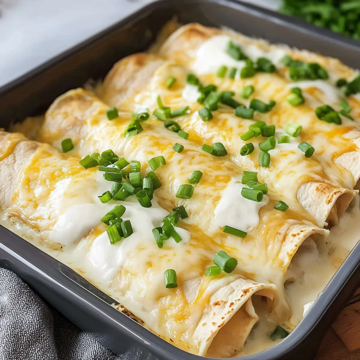 Nehme die Sauerrahm-Hühnchen-Enchiladas aus dem Ofen und lasse sie kurz abkühlen. Garniere die Enchiladas mit den dunklen Teilen der grünen Zwiebeln. Serviere sie heiß und genieße das köstliche Aroma und die cremige Textur, die dein Abendessen zu etwas ganz Besonderem machen!