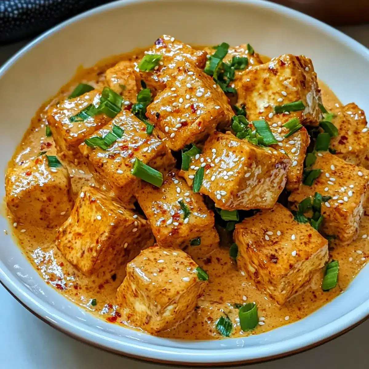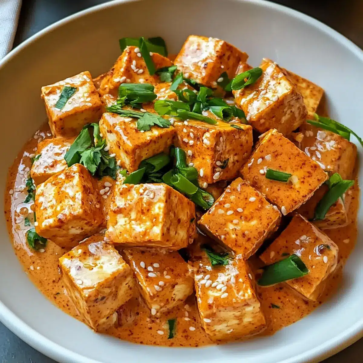 Scharfer Tofu mit cremiger Kokosnusssoße genießen