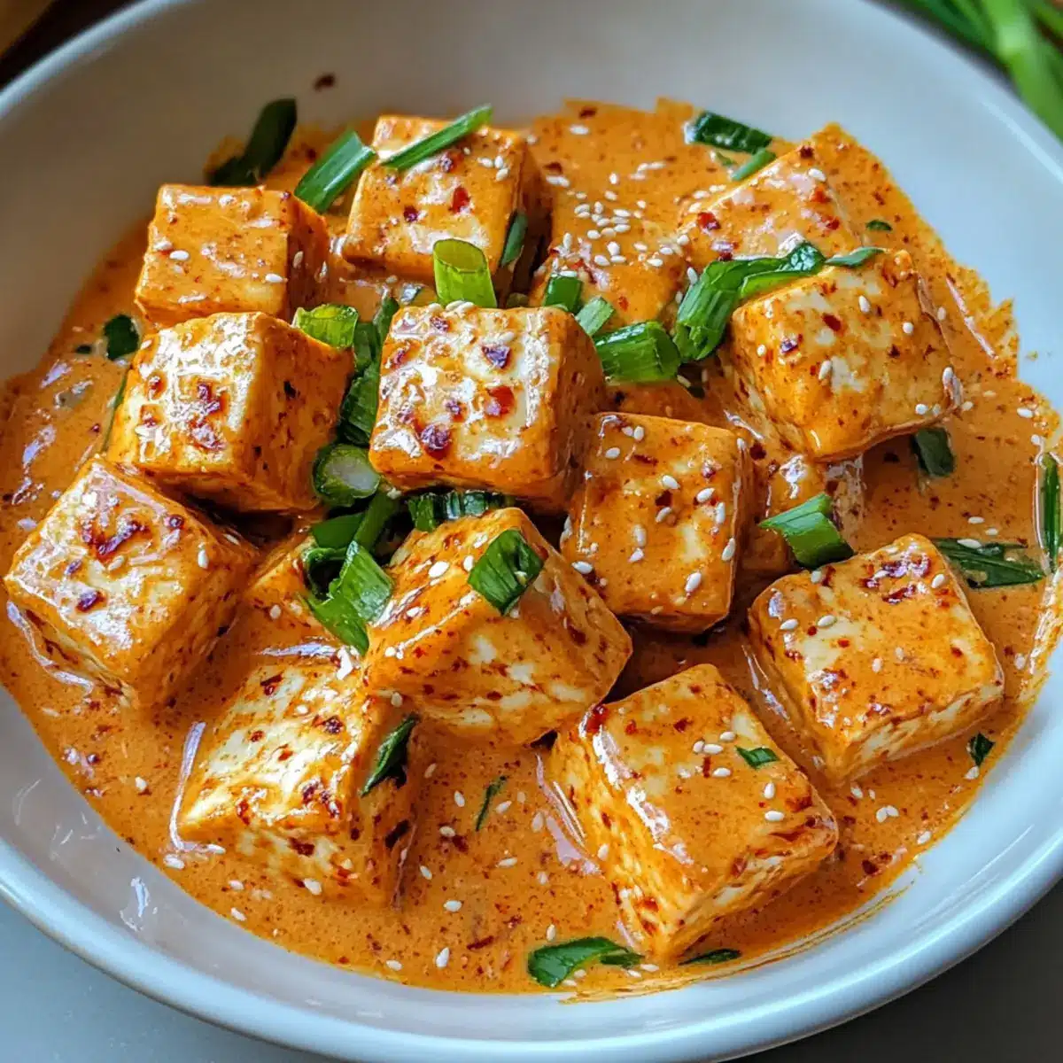 Serviere den scharfen Tofu mit cremiger Kokosnusssoße gleich warm. Garniere das Gericht mit frisch geschnittenen Frühlingszwiebeln, gerösteten Sesamsamen und optional roten Pfefferflocken für zusätzlichen Geschmack. Diese Kombination sorgt für einen einladenden Anblick und hebt die Aromen deines Gerichts hervor.