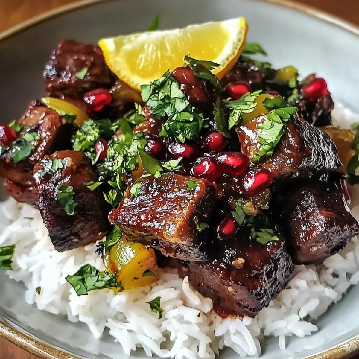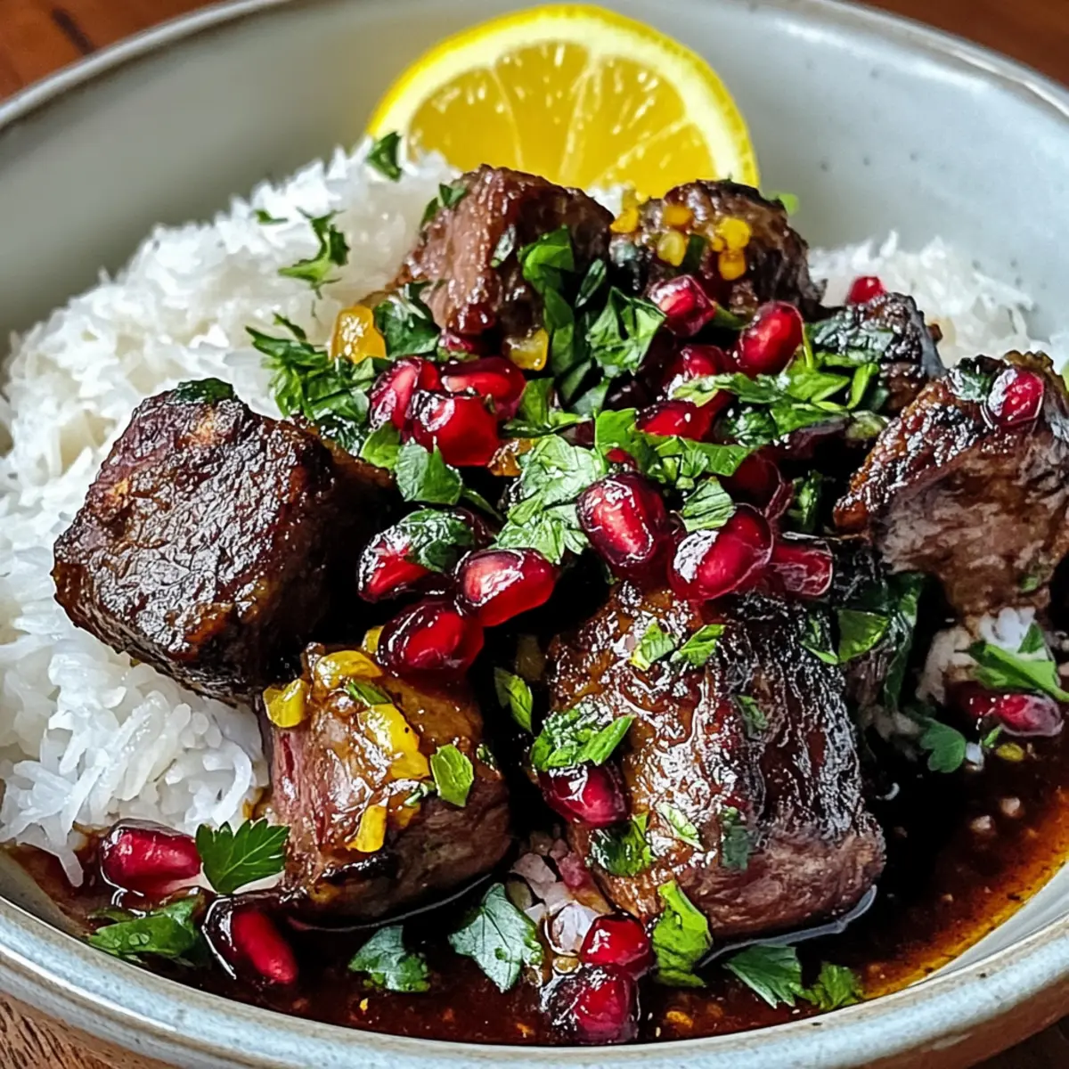 - Aromen integrieren: Gieße Granatapfelsirup und Zitronensaft über das Fleisch und lasse es köcheln.