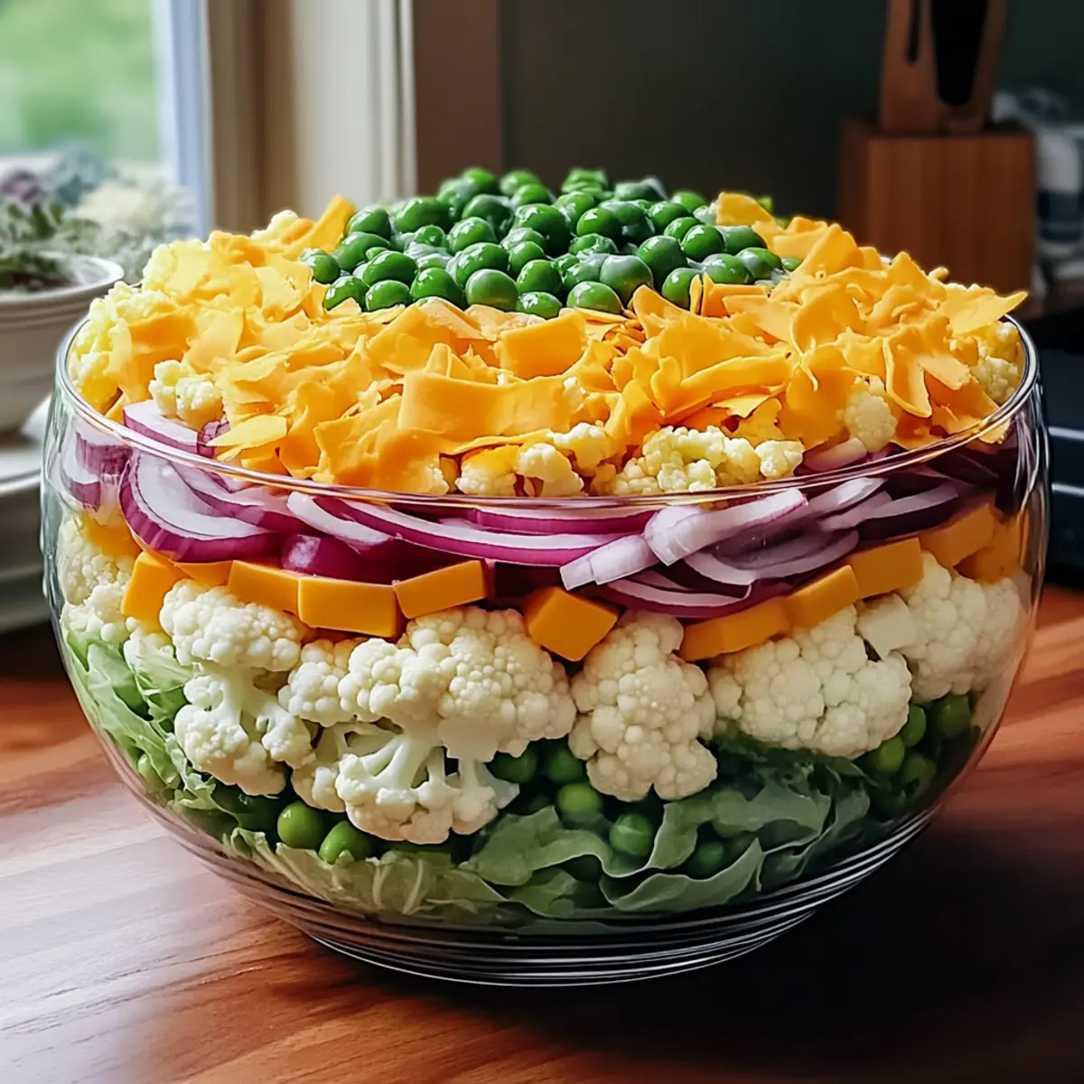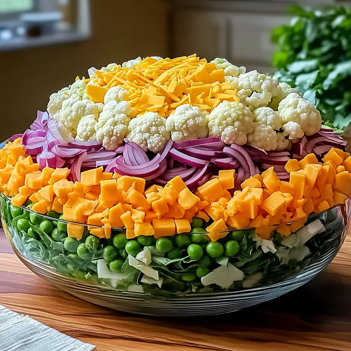 Bestreue die Salatbasis gleichmäßig mit den aufgetauten gefrorenen Erbsen, gefolgt vom zerkleinerten Blumenkohl. Die grünen Erbsen bringen einen süßen Farbklecks, während der Blumenkohl zusätzliche Textur und Geschmack bietet. Achte darauf, dass die Schichten sanft gegeneinander gedrückt werden, um die Stabilität des Salats zu gewährleisten.