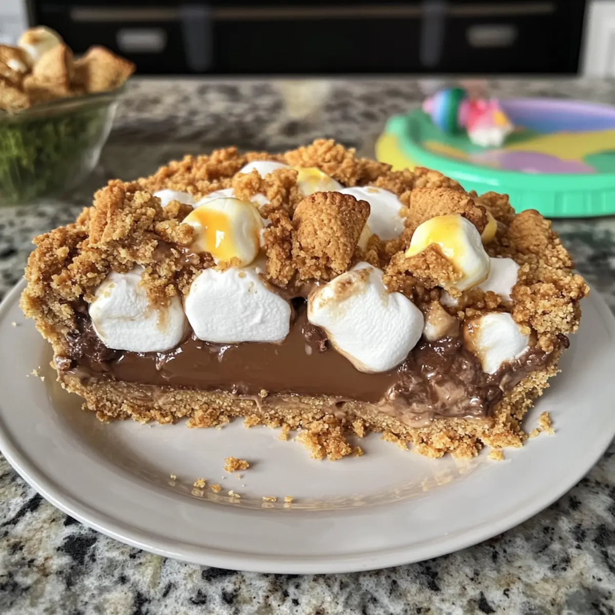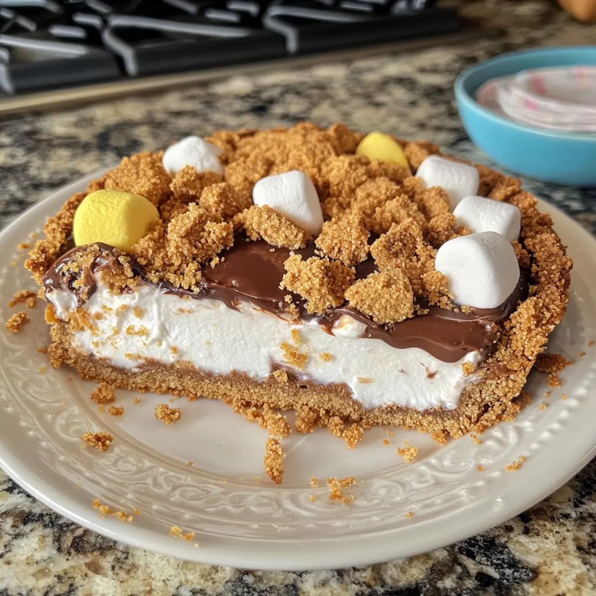 Platziere die Graham-Cracker-Kruste in eine runde Backform. Schichte die Hälfte der Mini-Marshmallows und die Hälfte der Marshmallow-Créme gleichmäßig auf dem Boden der Kruste. Achte darauf, dass sie gut verteilt sind, damit der Kuchen gleichmäßig aufgeht.