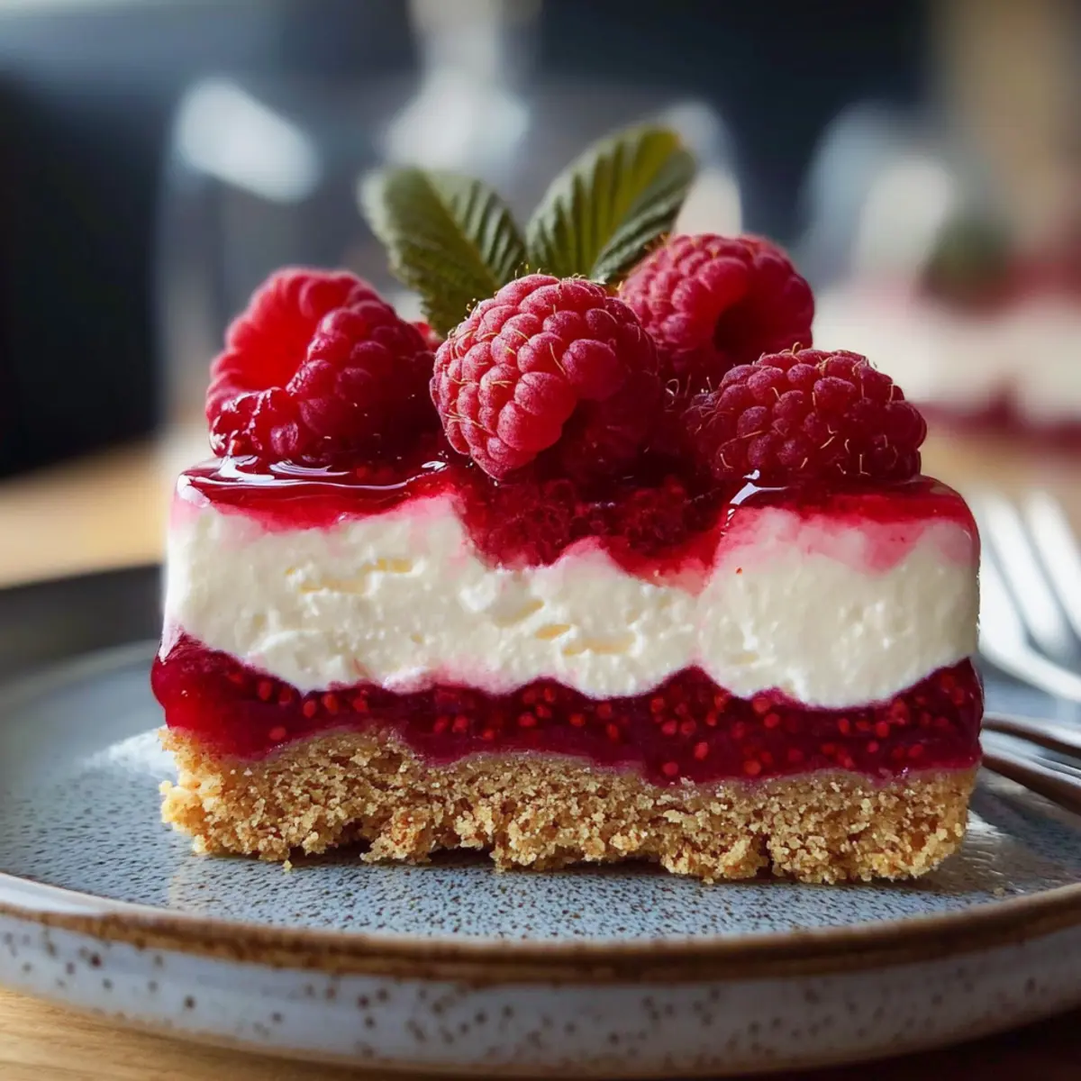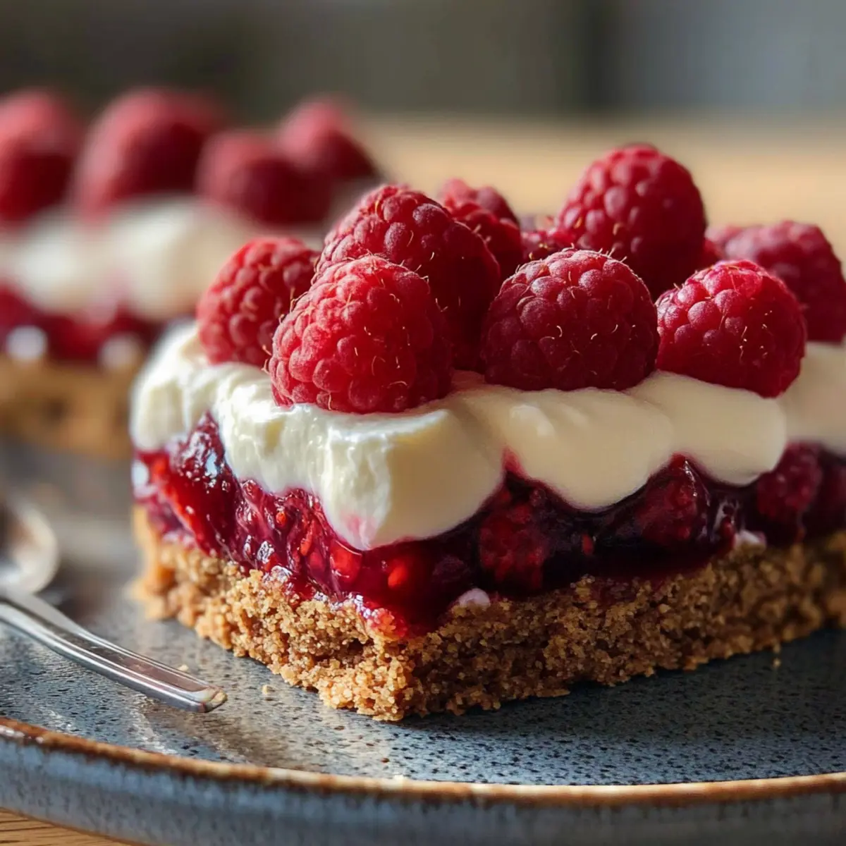 - Wasche die frischen Himbeeren gründlich und lasse sie auf einem Küchentuch abtropfen. Streue die Himbeeren gleichmäßig auf die Quarkschicht und drücke sie sanft hinein.