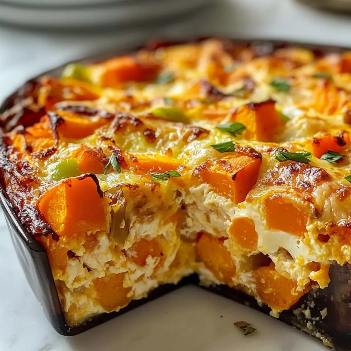 - Gieße die Eiermischung gleichmäßig über die gebackenen Süßkartoffeln in der Auflaufform und streue den restlichen Cheddar-Käse darüber.