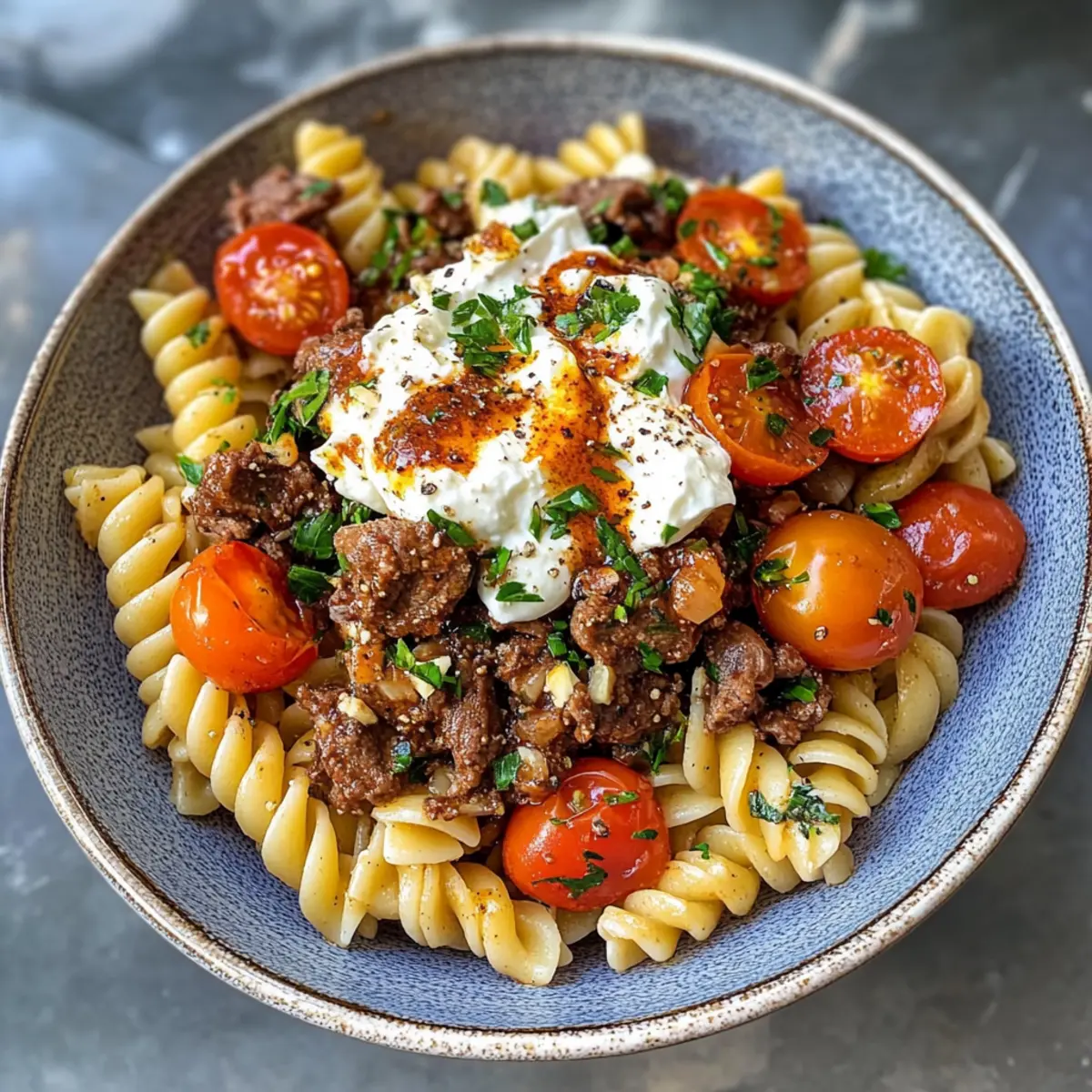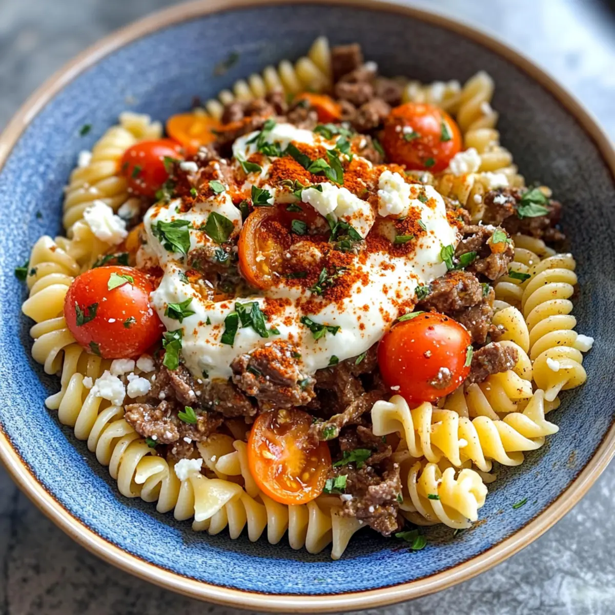 In einer Servierschüssel die gekochte Pasta mit dem würzigen Rindfleisch vermengen. Stelle sicher, dass die Pasta gleichmäßig mit der Fleischmischung bedeckt ist. Gieße dann den cremigen Knoblauchjoghurt großzügig über die Pasta und das Fleisch und verstreiche ihn sanft.