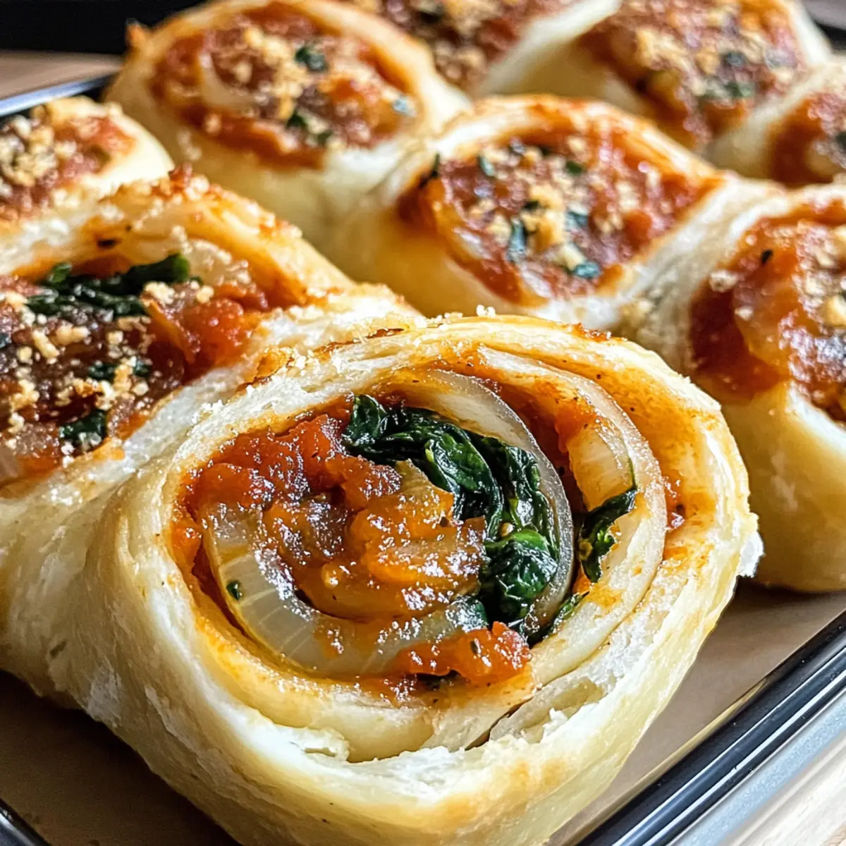 Verteile eine dünne Schicht Marinara-Sauce gleichmäßig auf dem ausgerollten Teig. Danach verteile gleichmäßig die Zwiebel-Spinat-Mischung darauf und lasse einen kleinen Rand frei. Rolle den Teig von einer Seite her eng auf und schneide ihn in Stücke, die etwa 3–4 cm lang sind. Diese Portionen bilden deine köstlichen Pizza-Rollen.