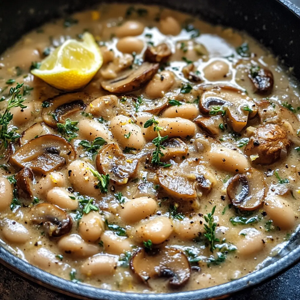 Reduziere die Hitze auf niedrig und gieße 120 ml Sahne oder Kokosmilch in die Pfanne. Füge 1 TL Dijon-Senf, 1 TL Thymian, sowie Salz und Pfeffer nach Geschmack hinzu. Lasse die Mischung für weitere 2-3 Minuten sanft köcheln, bis sie schön cremig ist. So erhält die Weiße Bohnen und Pilz-Pfanne Einfache Vegetarische Abendessen ihre perfekte Konsistenz.