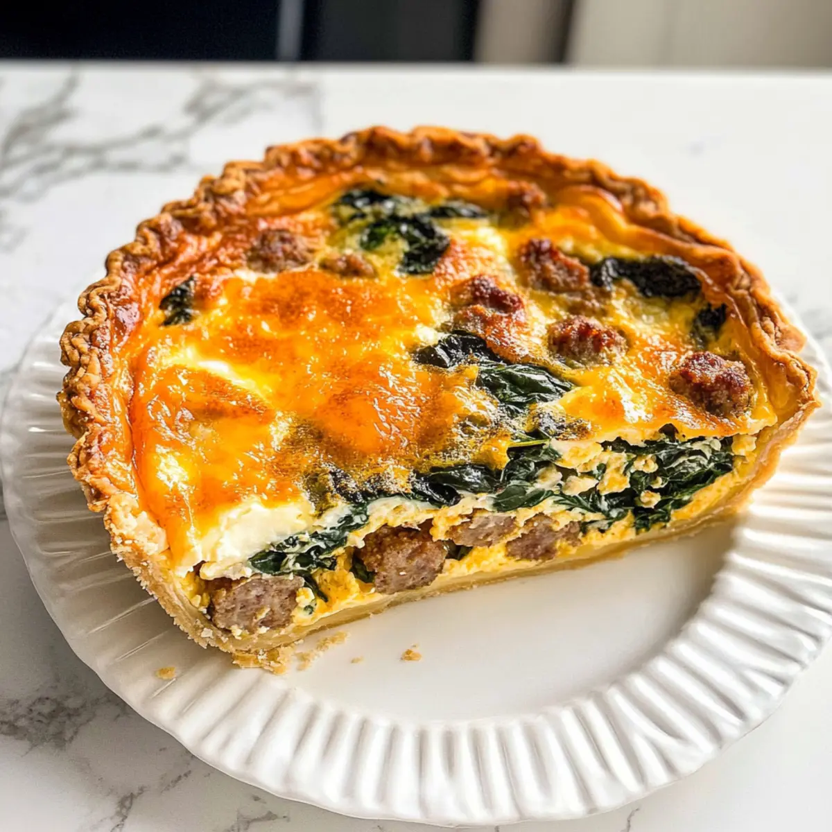 Proteinreich und sättigend: Mit würziger Bratwurst, Eiern und Käse ist diese Quiche ein kräftiger Start in den Tag, der dich lange satt hält.